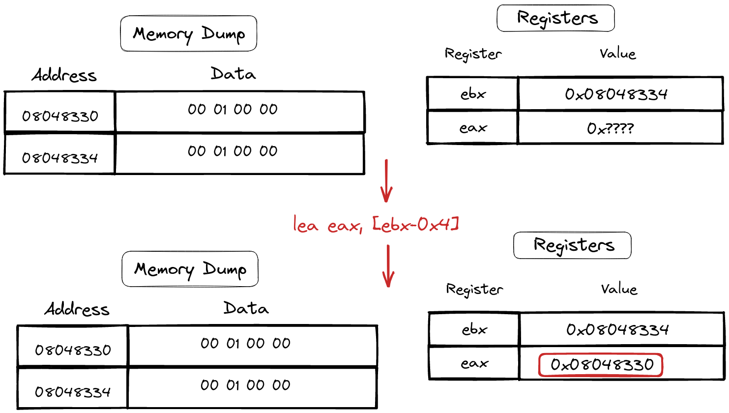 In the dance of assembly code, âleaâ gracefully takes the memory address provided by the source register (here, ebx), twirls it with a specified offset (-0x4), and elegantly places it into the destination register (eax).