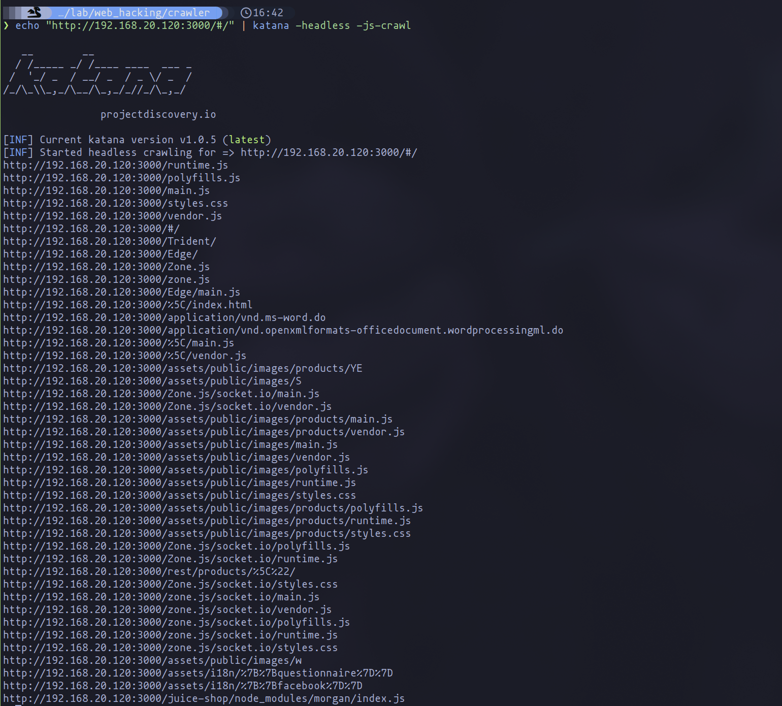 Our quest for exhaustiveness leads us to the -js-crawl flag, enabling Katana to scrutinize JavaScript files for hidden links: