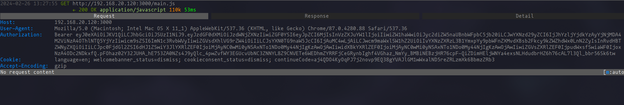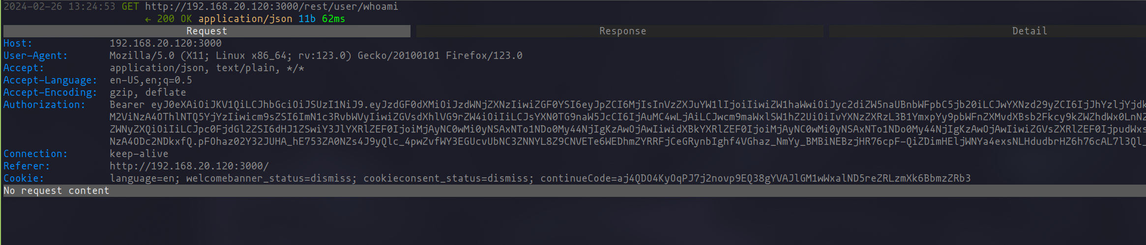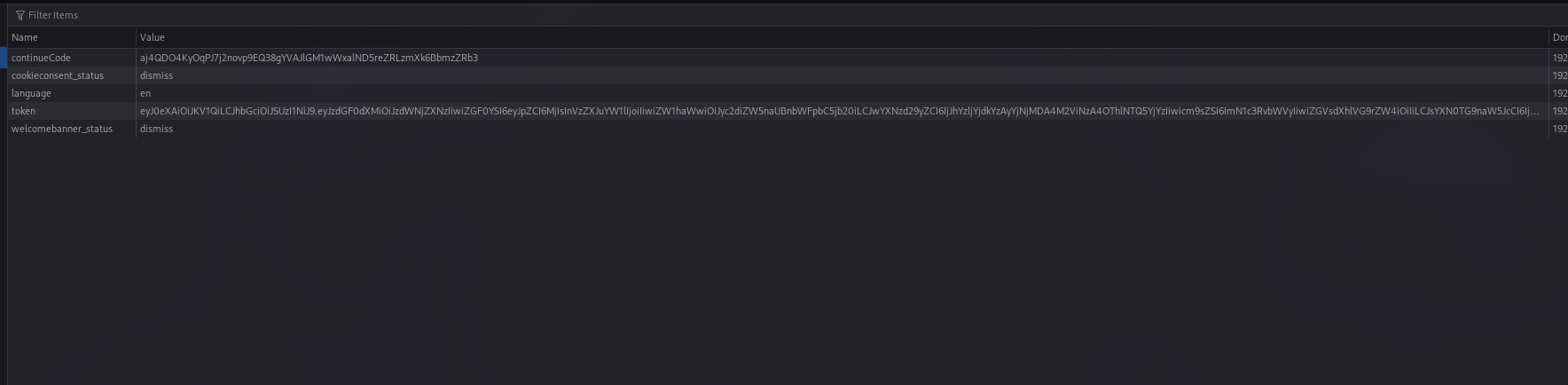 Retrieving this JWT can be achieved in a couple of ways. You could use the browser’s developer tools, accessed with the F12 key, to inspect the cookies directly. Alternatively, proxy tools such as mitmproxy, Burp Suite, or OWASP ZAP can be employed to capture the necessary requests and thus obtain the tokens and cookies used in authenticated sessions.