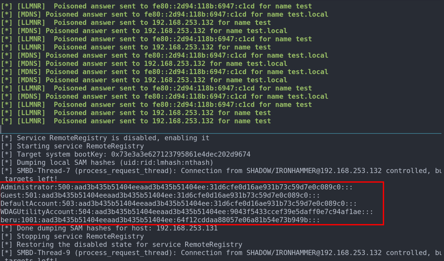 Once the poisoned request from the ‘iron’ user is captured, it’s rerouted to PC-BERU. If ‘iron’ has administrator access, the floodgates open to command execution. The attack’s climax is marked by dumping the SAM, revealing the sensitive underbelly of the target system.