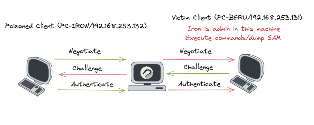 From capturing hashes, we now transition to a more direct form of attack - the NTLM Relay. A sophisticated technique that hijacks connections through protocol poisoning. This strategy revolves around rerouting connections, initially aimed at the attacker’s computer, to a target machine. The key? These intercepted connections, especially from administrator users, become a powerful tool for executing commands on the target system.