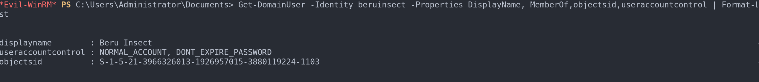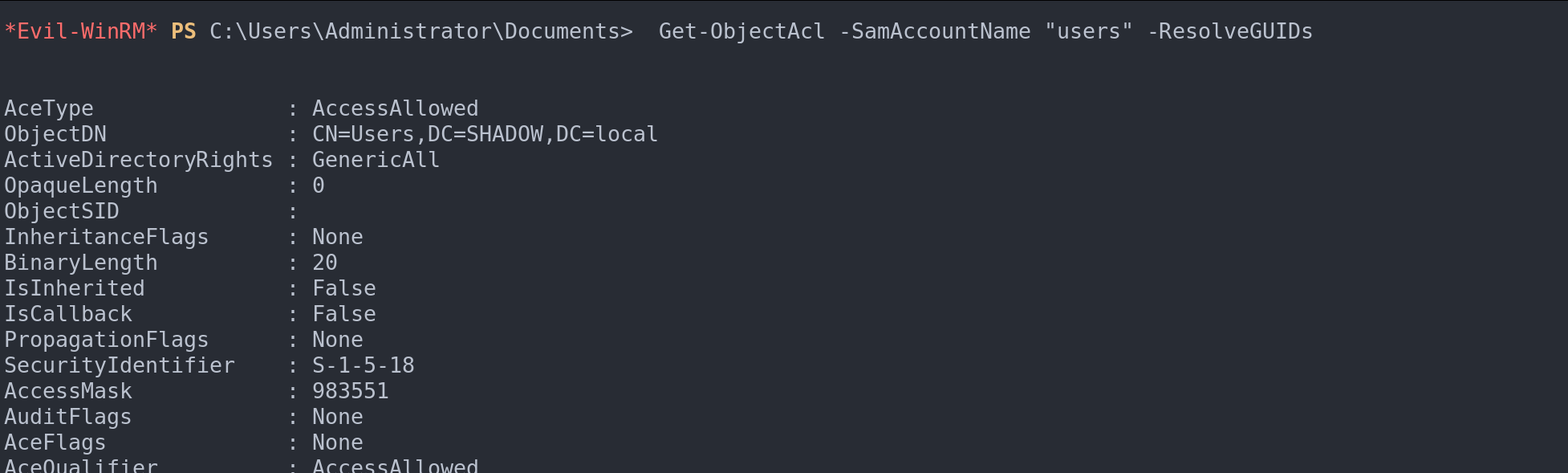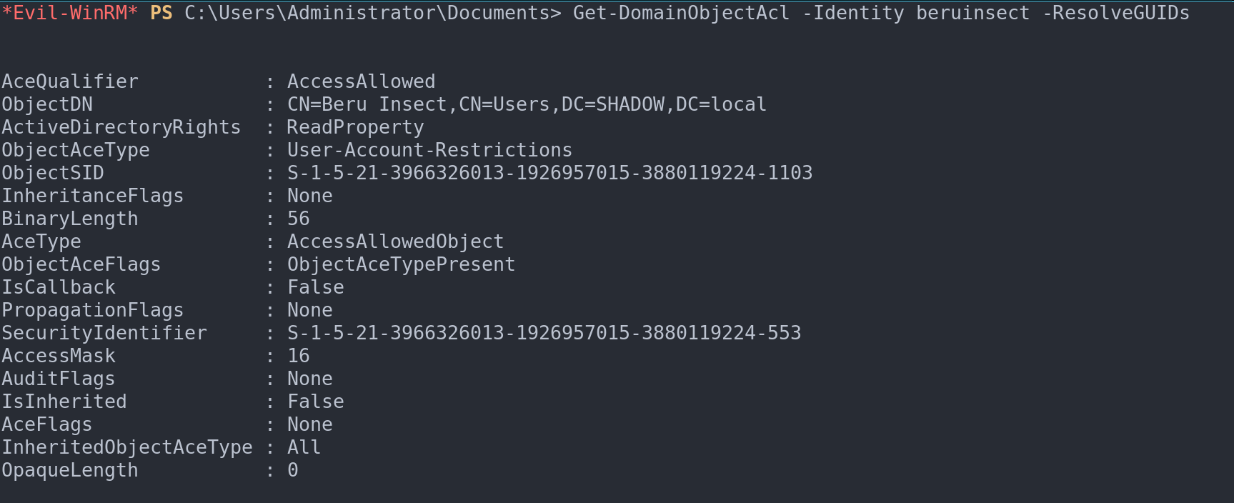 Investigating ACLs linked to a specific user is also a breeze with Get-DomainObjectAcl -Identity <user> -ResolveGUIDs. This function is particularly useful when assessing the access rights and permissions of a user within the AD environment.