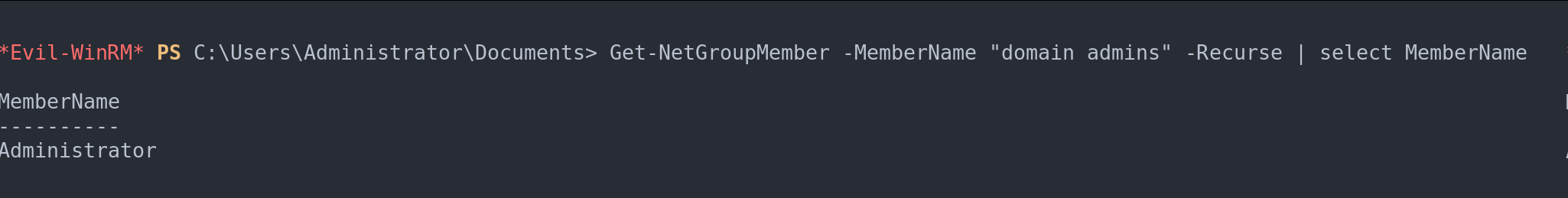 Get-NetGroupMember -MemberName "domain admins" -Recurse | select MemberName