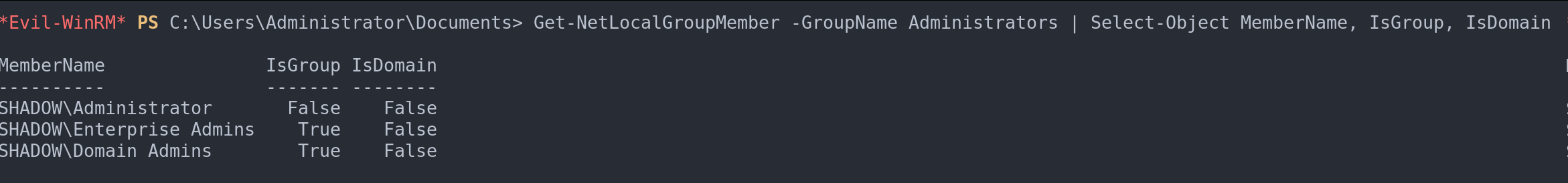 Get-NetLocalGroupMember -GroupName Administrators | Select-Object MemberName, IsGroup, IsDomain