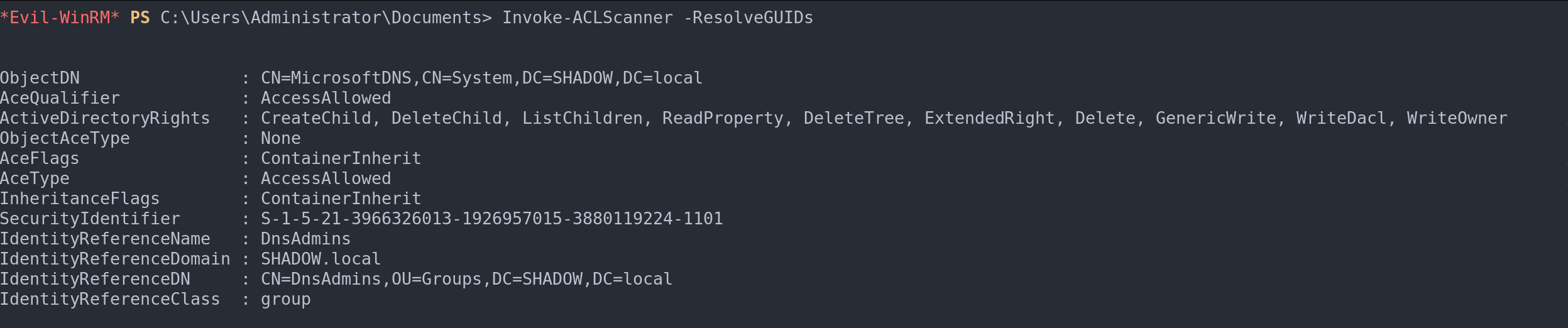 To dig deeper and find ACLs of particular interest or potential vulnerabilities, Invoke-ACLScanner -ResolveGUIDs is our go-to command. It scans and highlights ACLs that might be exploitable for privilege escalation or unauthorized access.