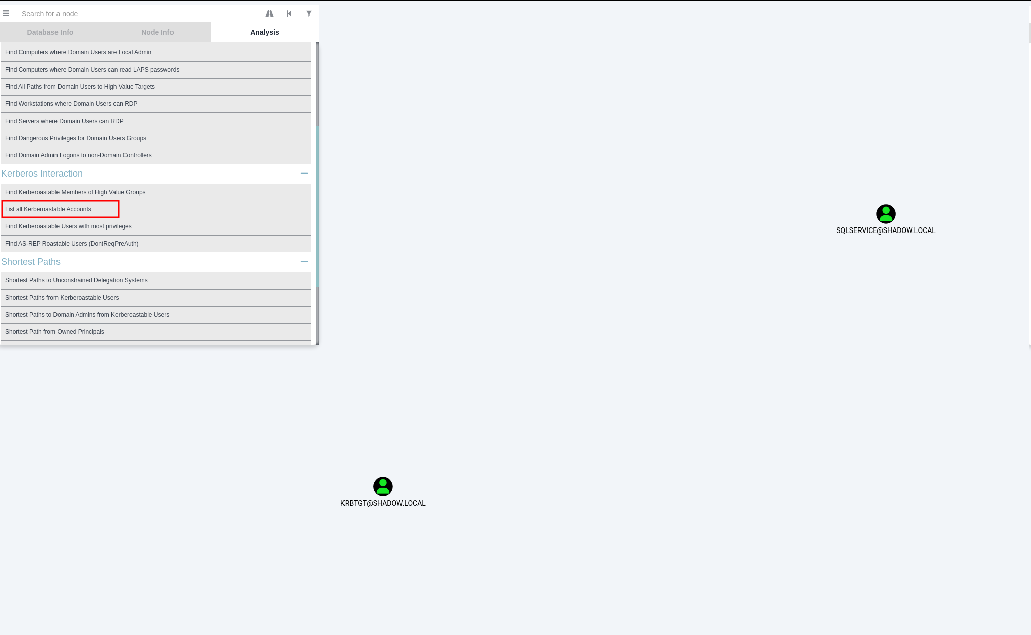 Once we’ve loaded the data into BloodHound, we embark on a journey of analytical possibilities. This powerful tool unfolds a variety of predefined paths for exploration. For instance, it effortlessly reveals users within the Active Directory who are susceptible to Kerberoasting. This feature is pivotal as it helps us pinpoint potential targets for elevating our privileges within the domain.