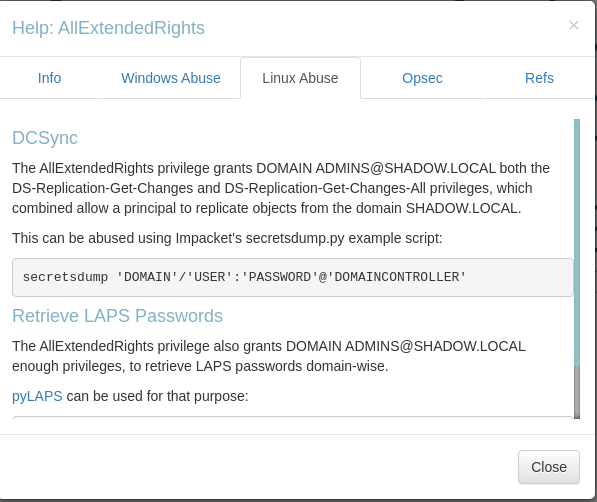 What’s truly captivating about BloodHound is its ability to provide detailed guidance on how to exploit specific configurations. A simple right-click on any graph link reveals necessary information for leveraging that particular setup. This level of detail is invaluable, especially when dealing with extended rights and other intricate aspects of Active Directory.