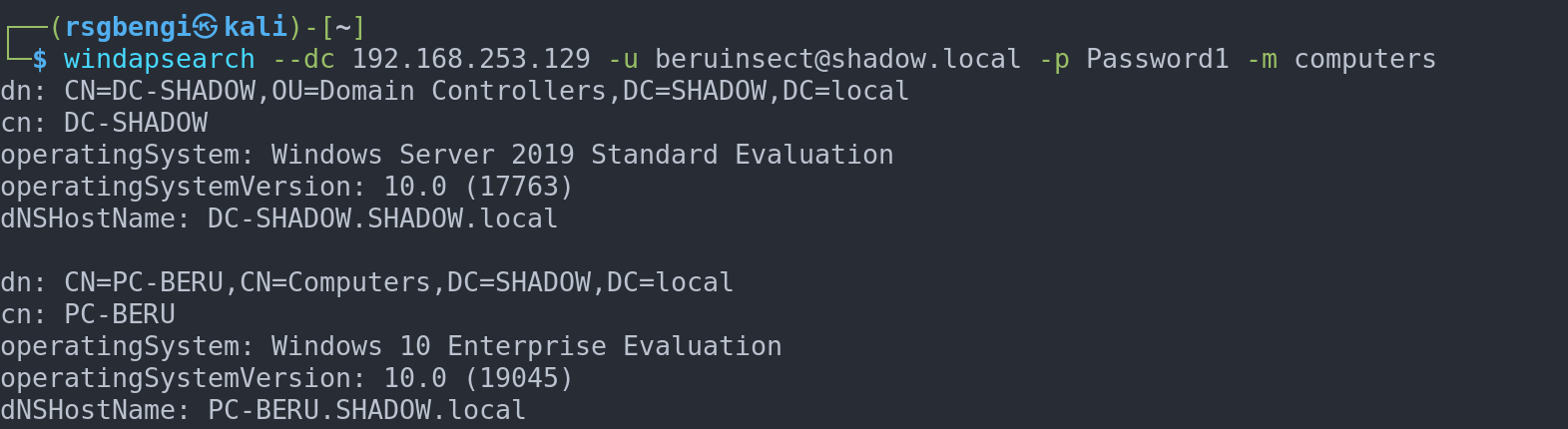 windapsearch --dc 192.168.253.129 -u beruinsect@shadow.local -p Password1 -m computers