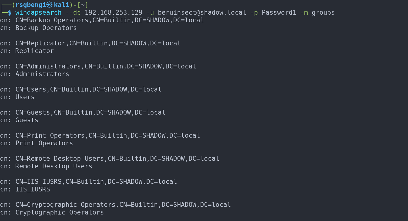 windapsearch --dc 192.168.253.129 -u beruinsect@shadow.local -p Password1 -m groups