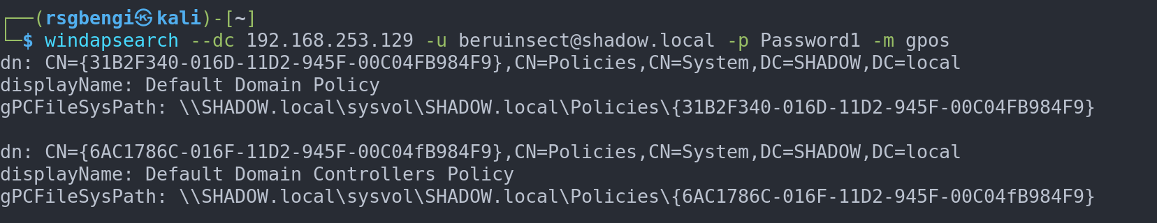 windapsearch --dc 192.168.253.129 -u beruinsect@shadow.local -p Password1 -m gpos