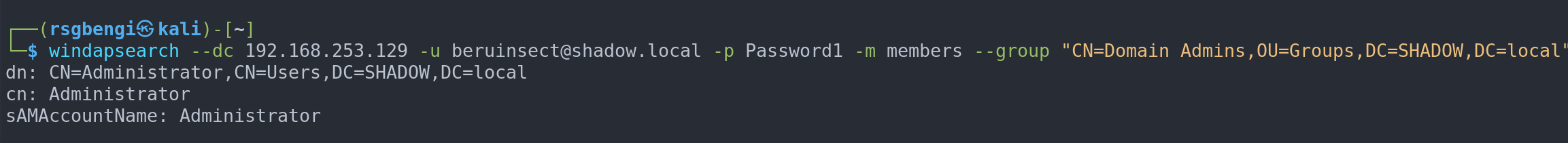 windapsearch --dc 192.168.253.129 -u beruinsect@shadow.local -p Password1 -m members --group "CN=Domain Admins,OU=Groups,DC=SHADOW,DC=local"