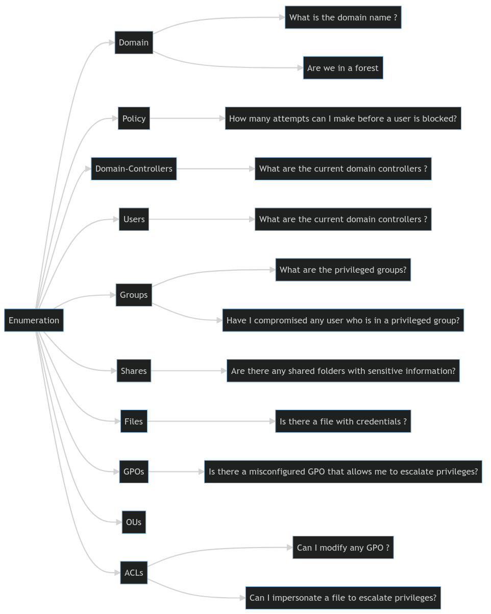 In manual enumeration, asking the right questions is as important as the tools you use. A well-structured approach, as outlined in the provided diagram, guides you through a thorough and effective enumeration process. It’s about piecing together the puzzle of a domain’s structure and vulnerabilities, one detail at a time.