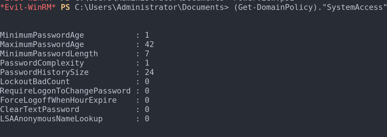 The password policy in an Active Directory domain is a critical aspect of security, and PowerView offers an efficient way to examine these policies. It’s particularly useful when considering brute force attacks, as a robust password policy can be a significant barrier against such attempts. With PowerView, we can gain detailed insights into these policies using the command: