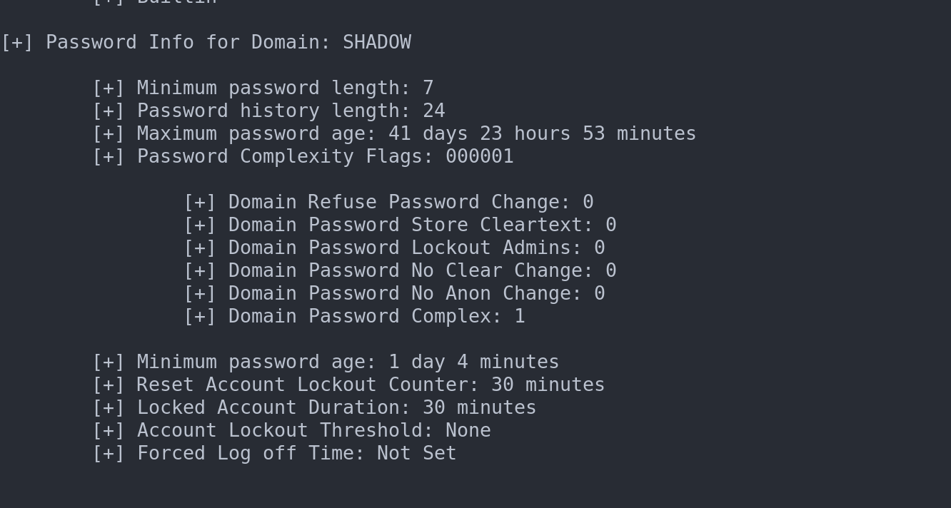 crackmapexec smb <targets> -u <user> -p <pass> --pass-pol