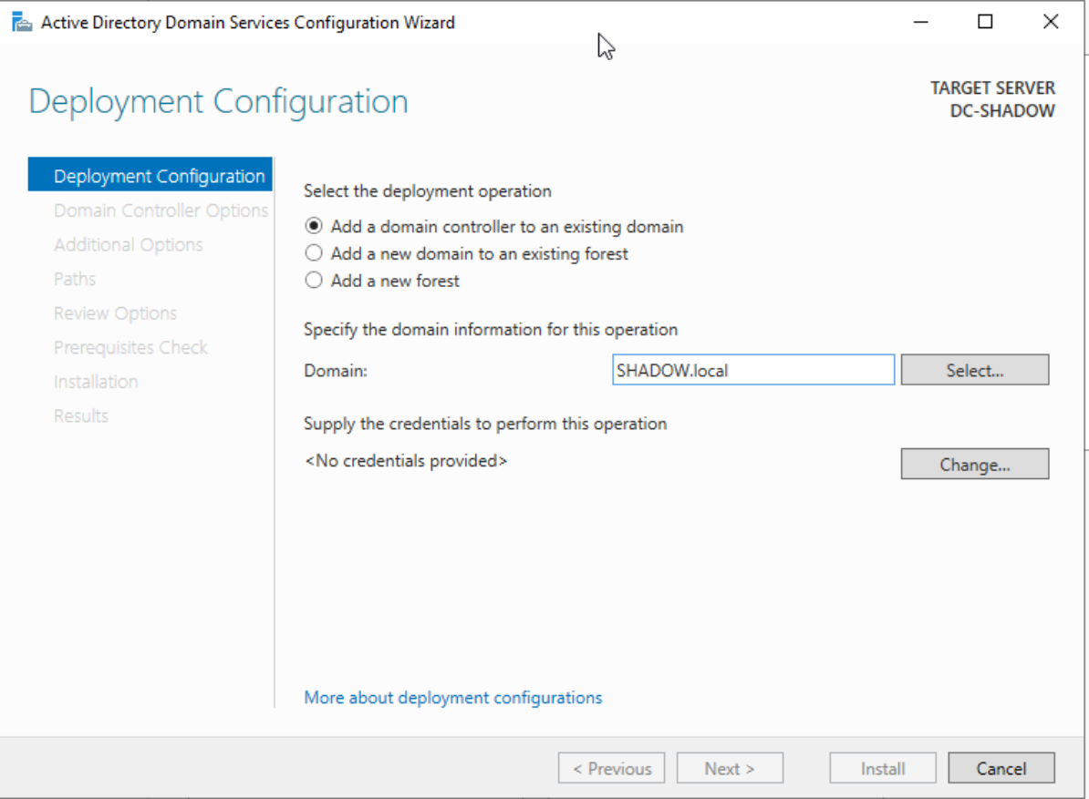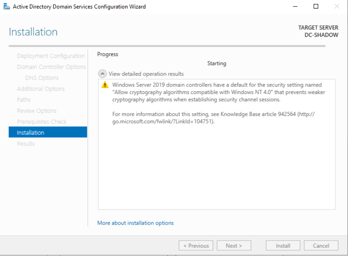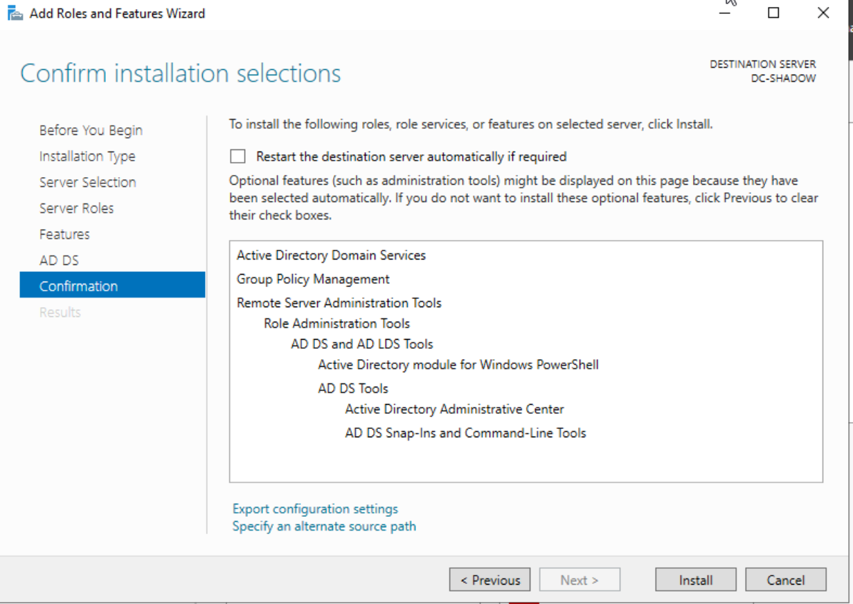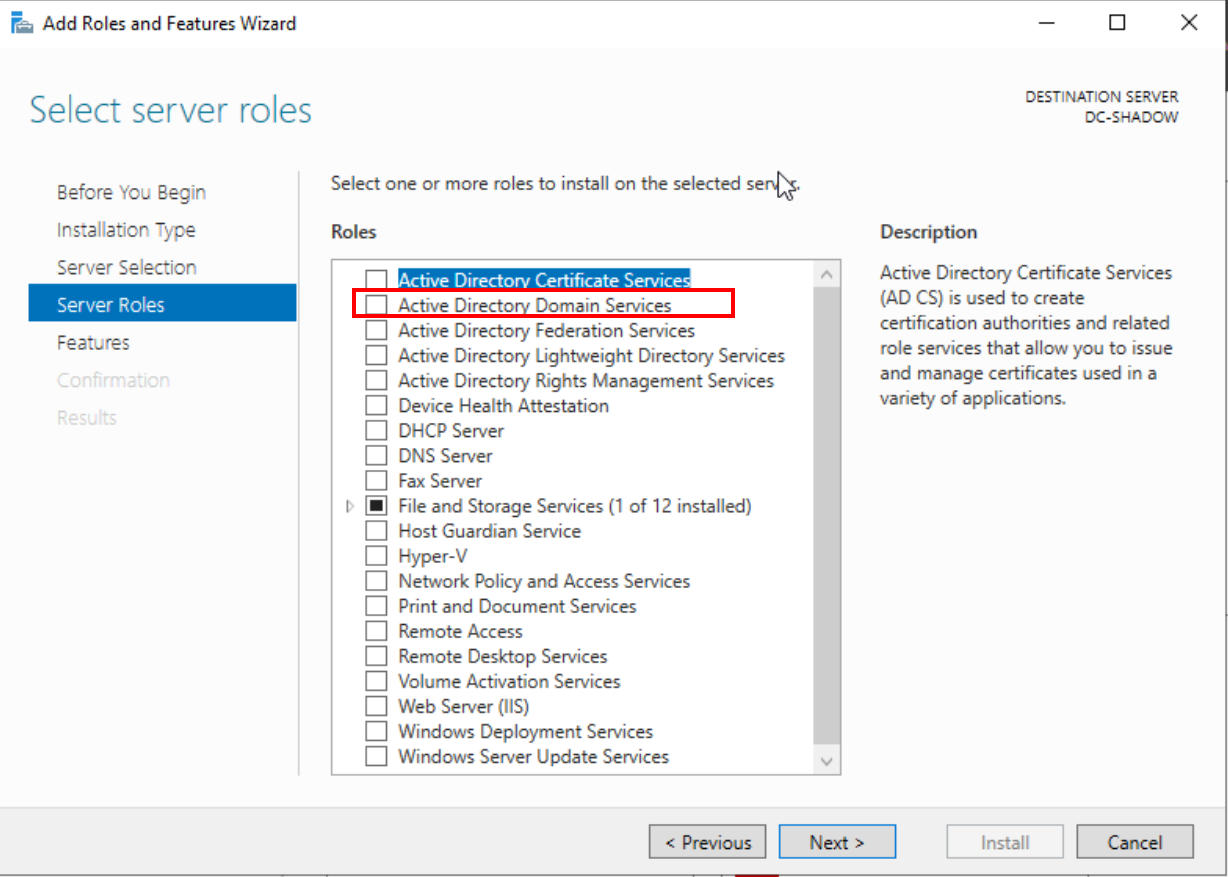 Progress through the steps until you reach the ‘Active Directory Domain Services’ selection. Add this feature and march towards the end of the installation.