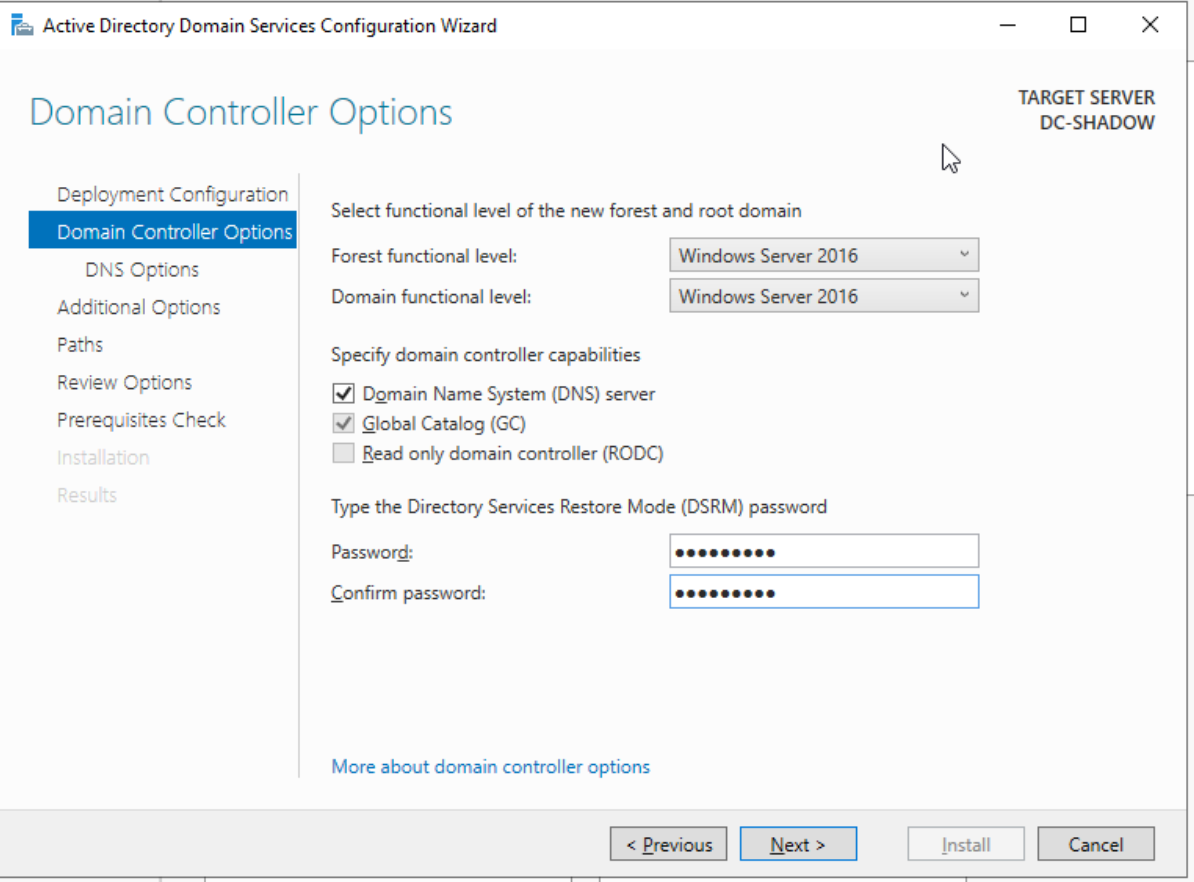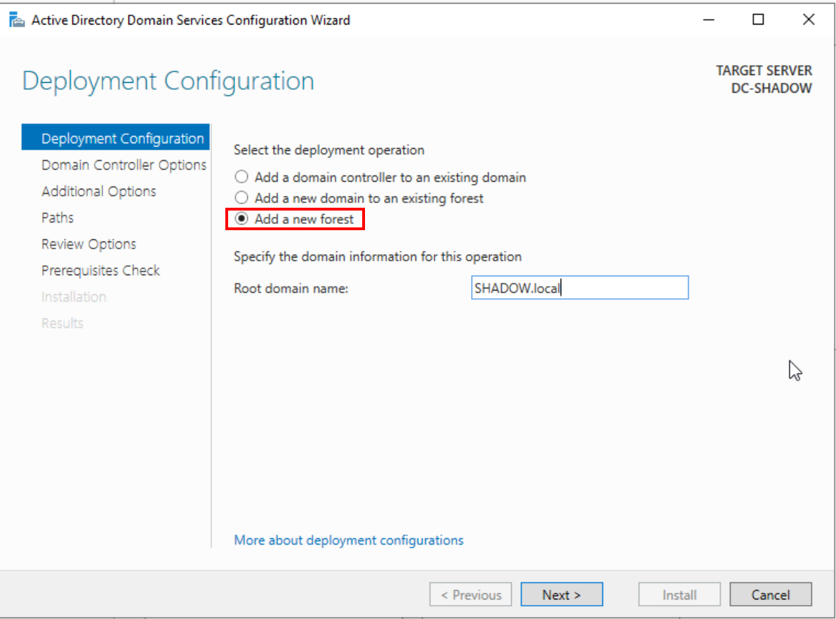 Input your chosen domain name, ensuring it ends with ‘.local.’ Opt for ‘Add new forest’ and proceed to set your administrative password.