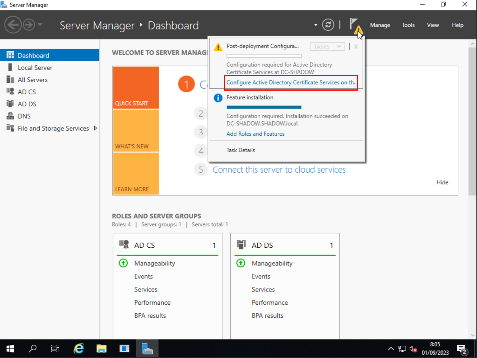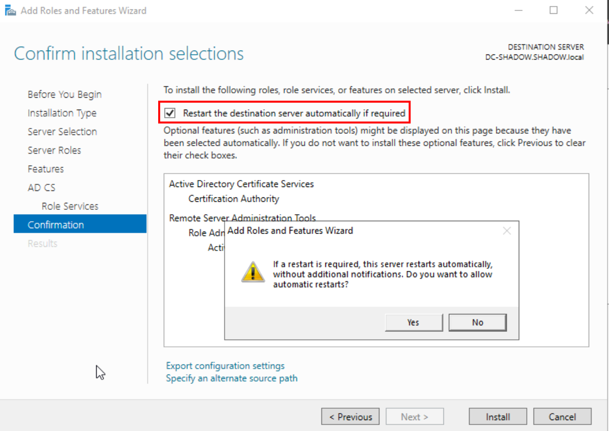 Back in the Server Manager, it’s time to add the certificate service, crucial for launching LDAPs and IPv6 attacks. Repeat the ‘Add roles and features’ steps, but this time, select ‘Active Directory Certificate Services’ and add the required features.