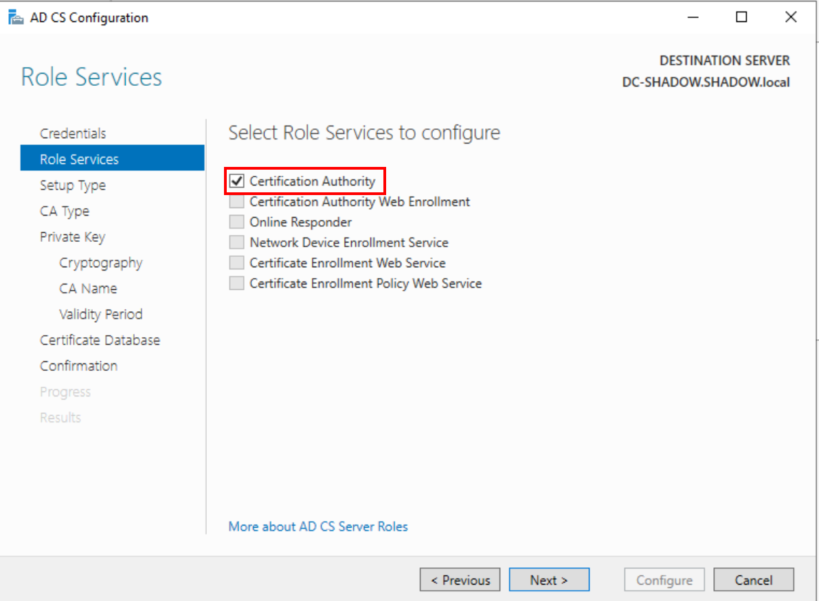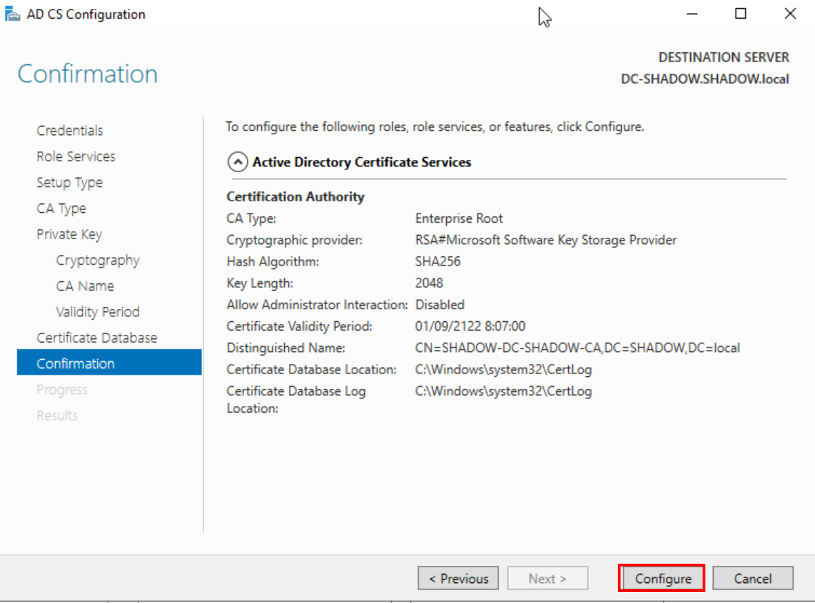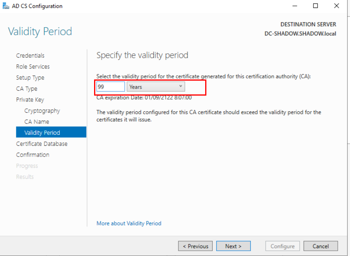 Post-installation, configure the certificate service, opting for ‘Certification Authority’ under ‘Role Service.’ Set a generous ‘Validity Period’ of 99 years (who knows how long your lab will be operational!), and finalize the setup with a ‘Configure’ click and a machine restart.
