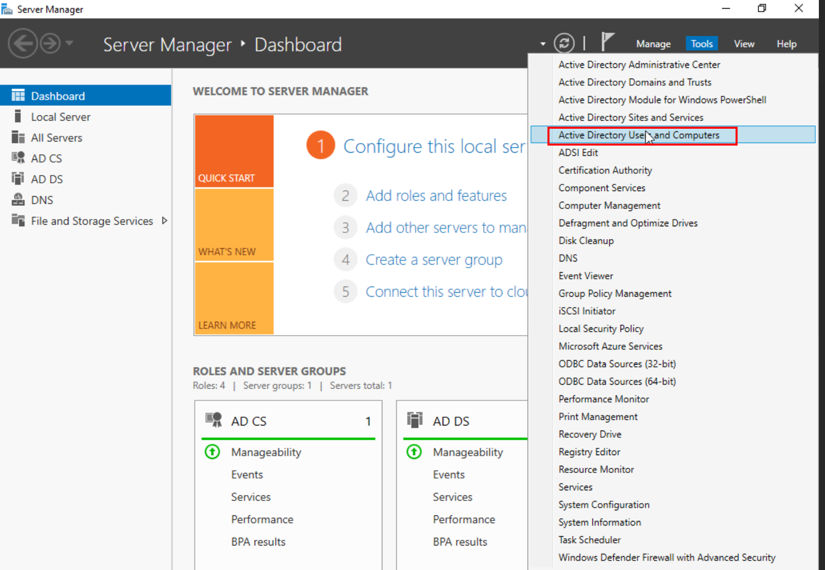 With the essential setup done, let’s populate our domain with users. Navigate to ‘Tools’ and select ‘Active Directory Users and Computers.’