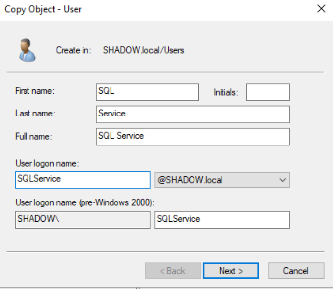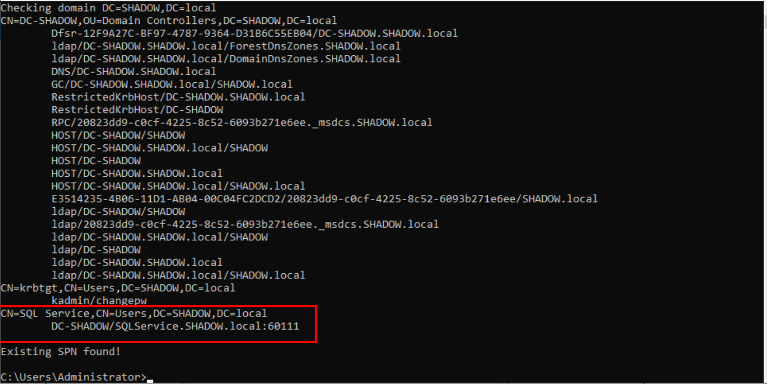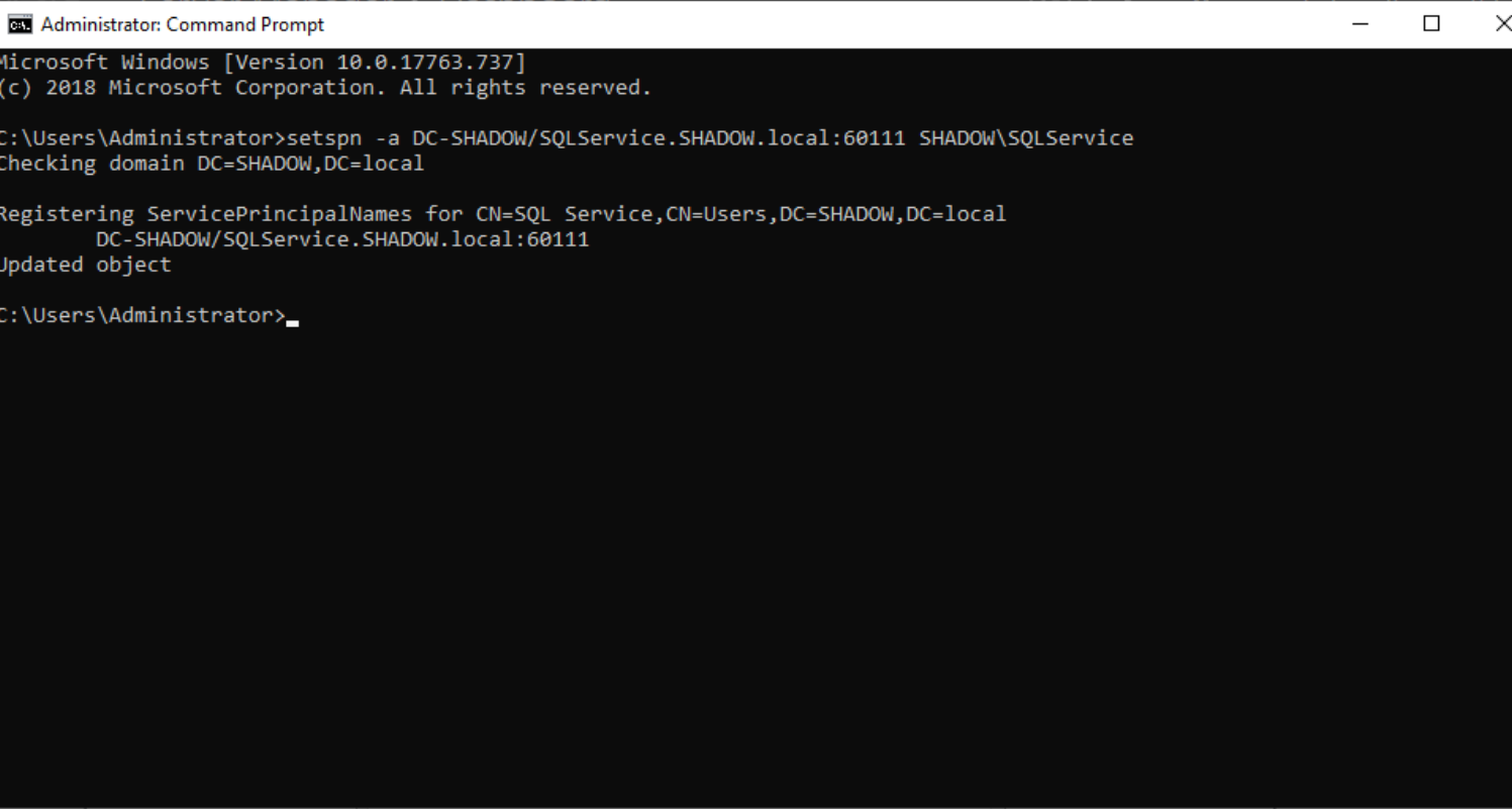 setspn -a DC-SHADOW/SQLService.SHADOW.local:60111 SHADOW\SQLService