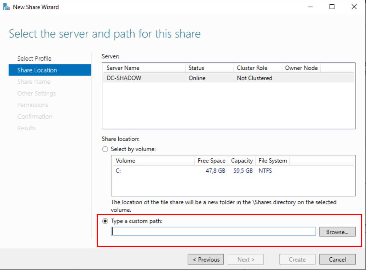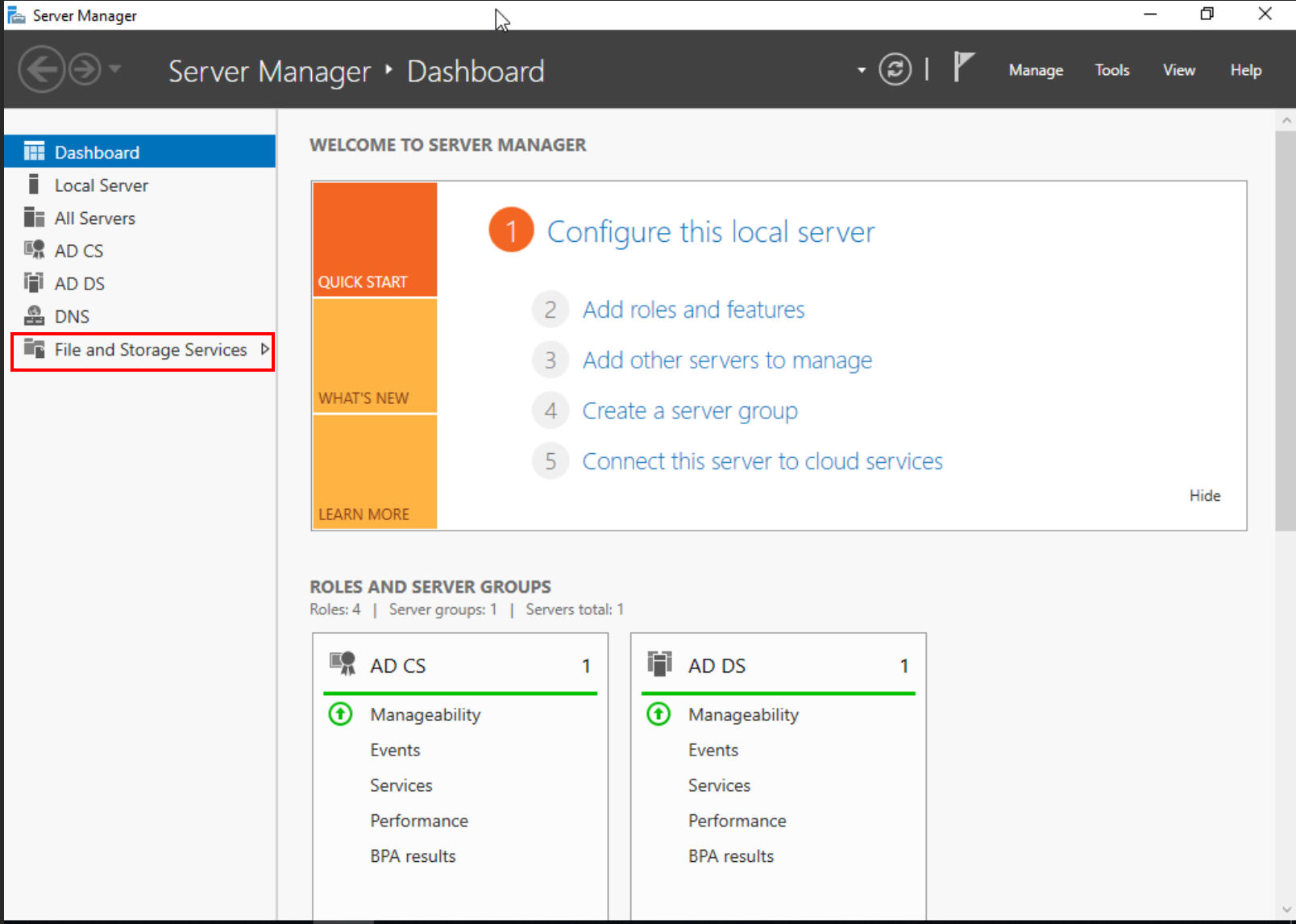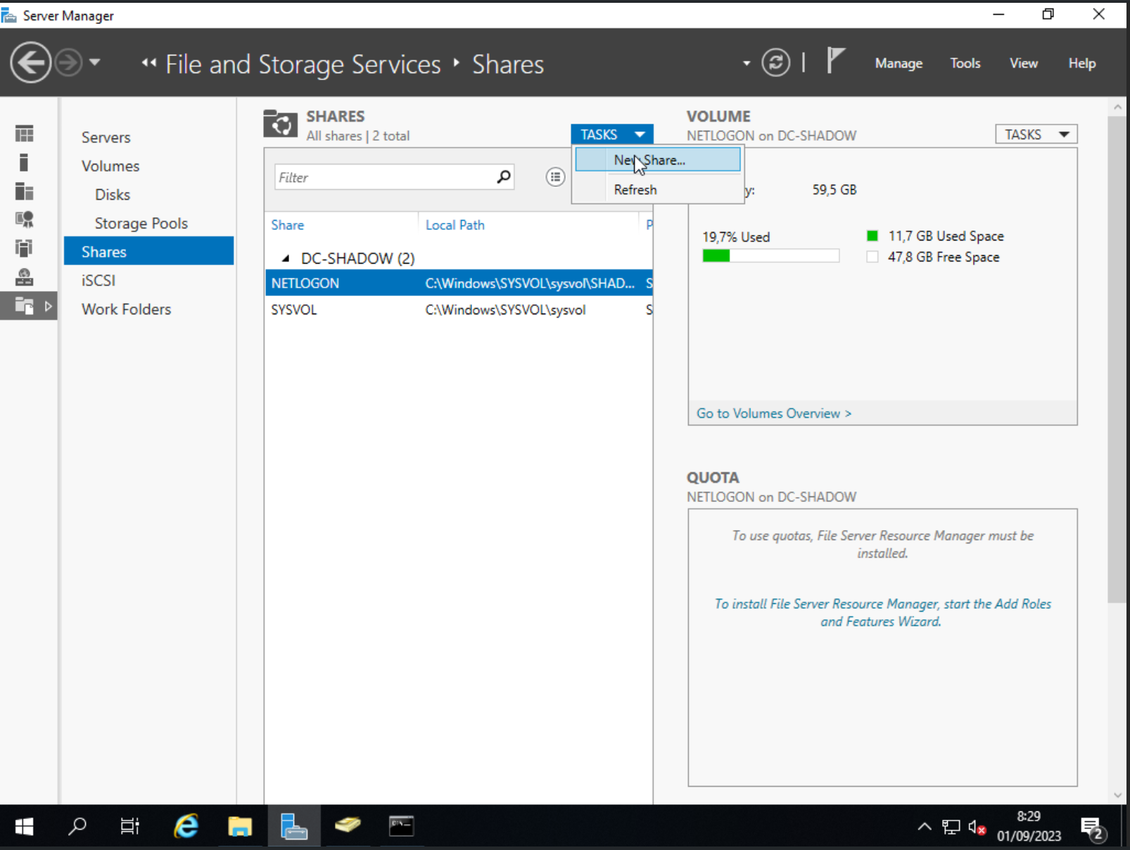 Head to ‘File and Storage Services’ in the Server Manager and opt to create a new folder.