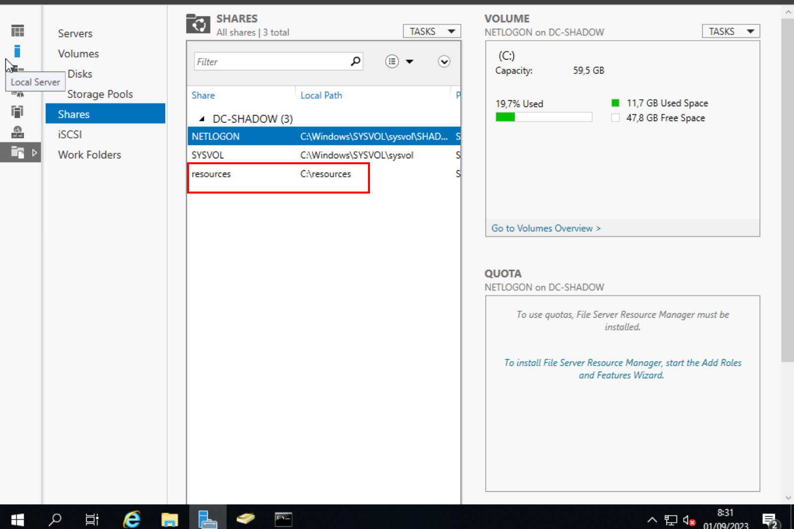 Setting up SMB is crucial for various reconnaissance and attack practices. Start by creating a ‘Resources’ shared folder on the C drive.