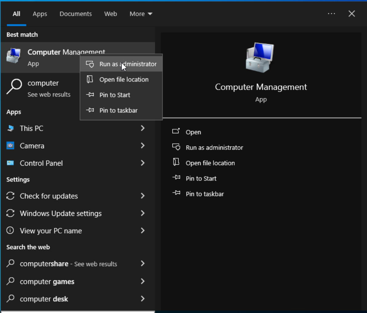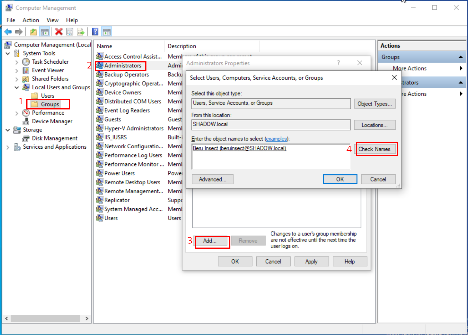 I have to make that user a local administrator of the machine (or domain). To promote it to administrator, I have to go to “Computer Management” and add the user to the administrators group.
