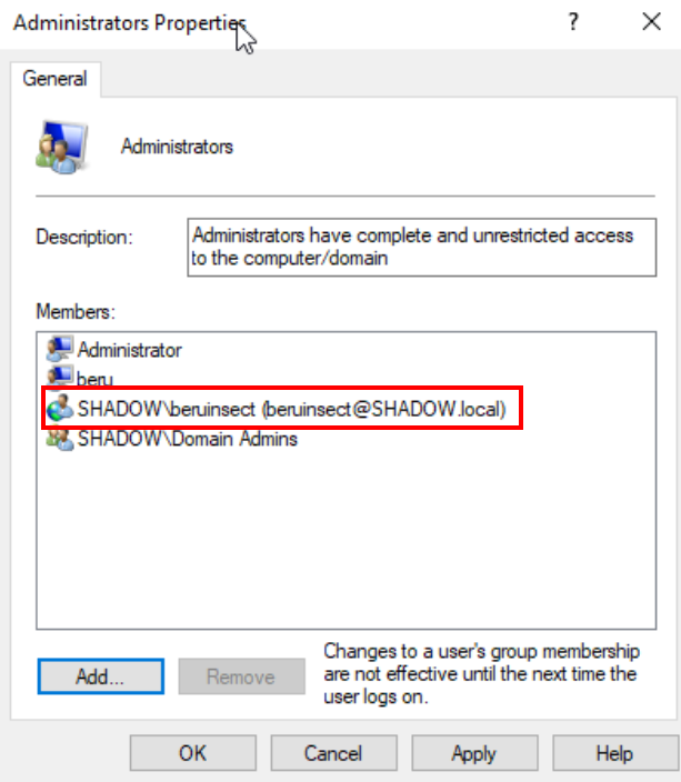 If all steps are correctly followed, you should see the domain user now listed as an administrator. It’s a significant milestone in setting up your domain for various attack simulations and learning experiences.