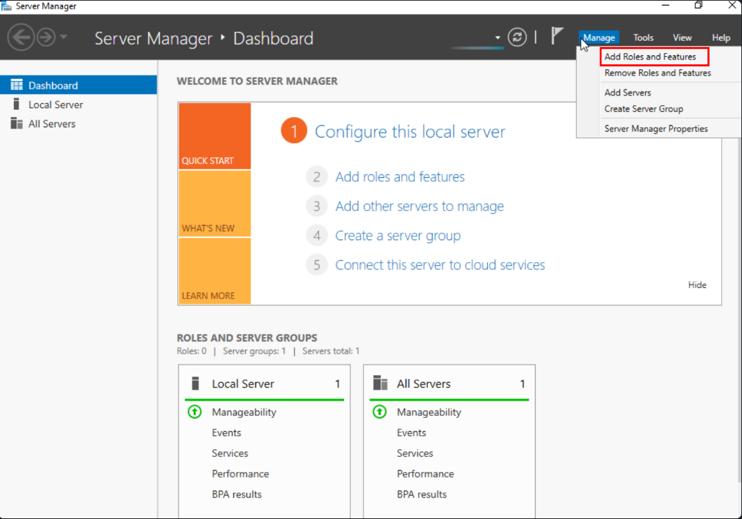 Post-renaming and a quick reboot, reopen ‘Server Manager.’ From here, click ‘Manage,’ followed by ‘Add roles and features.’