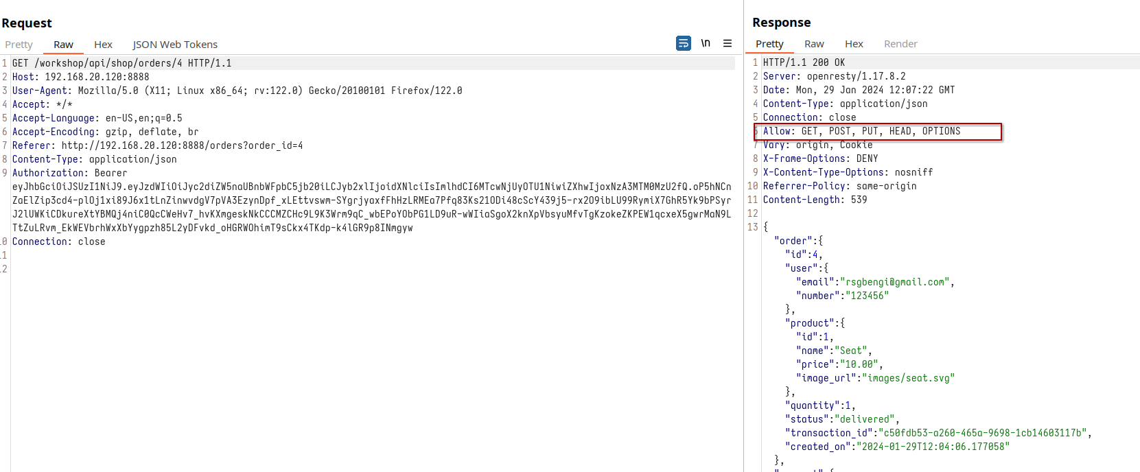 Upon reviewing the order, we uncover not just details about the item, but also various methods that the API permits. This is where our exploration takes an interesting turn: