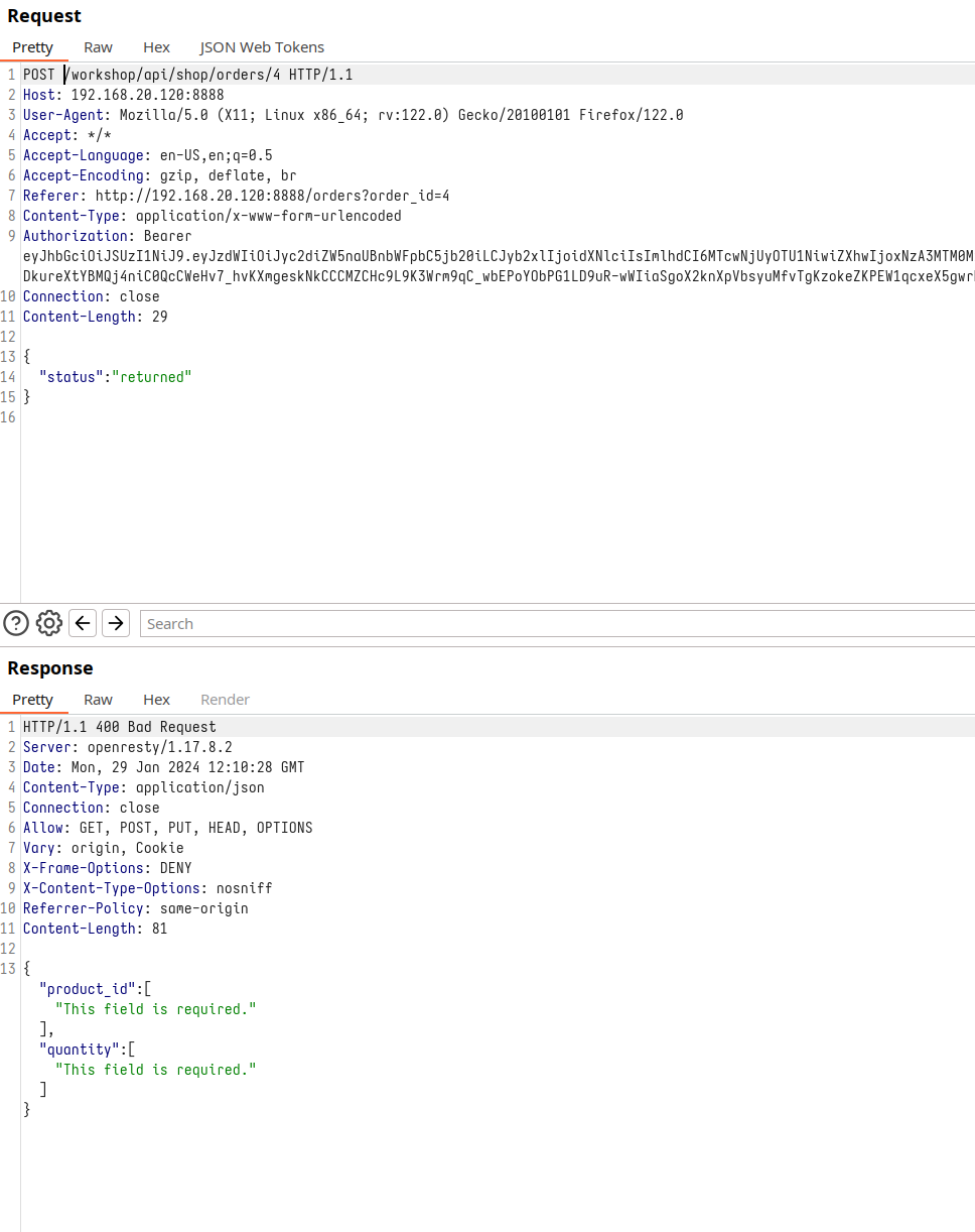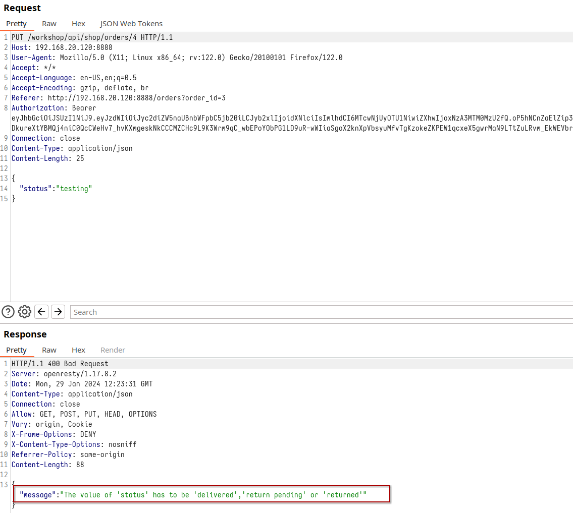 Conversely, should we make the adjustment to the request method by switching to PUT and incorporating the ‘status’ parameter, we may encounter a novel error within the server’s response. Specifically, this error will shed light on the potential statuses a product can assume: ‘Delivered,’ ‘Return Pending,’ or ‘Returned.’ At this juncture, the most intriguing choice would be to explore the ‘Returned’ option. By doing so, not only would we receive a refund for the product’s cost, but since the product is already in the shipping process, we would also obtain the item itself for free.