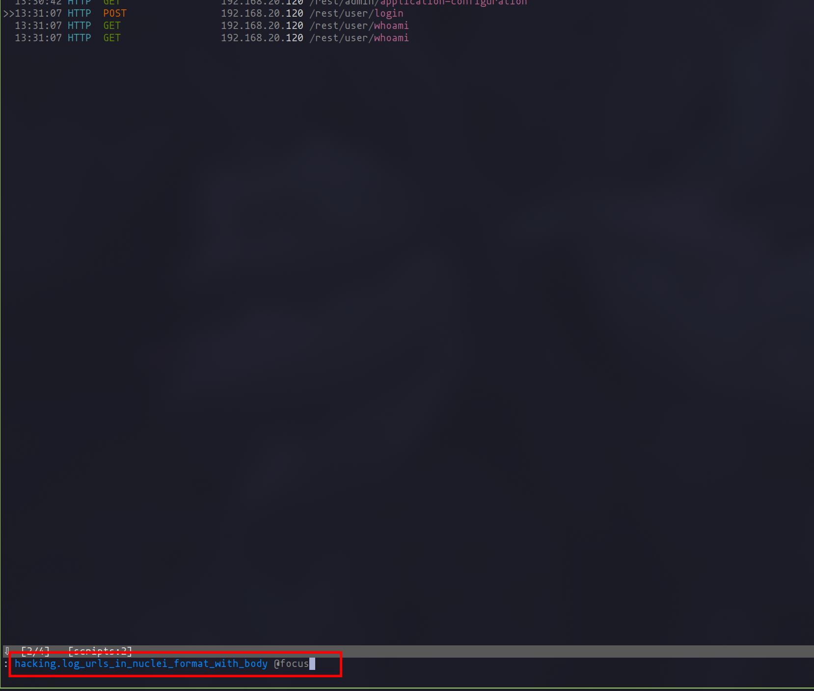 Auditing GET requests with Nuclei is fairly straightforward: we simply input the URL and, if necessary, provide authentication cookies for testing. However, auditing POST requests requires a more tailored approach due to the specific format needed for Nuclei analysis. To audit effectively with Nuclei, our captured request must be in one of the following formats: Burp, JSONL, YAML, OpenAPI, or Swagger. In this context, we’ll demonstrate how to convert a request into the JSONL format using a command in mitmproxy. Should you be utilizing Burp, you have the convenience of directly copying a request in the required format.