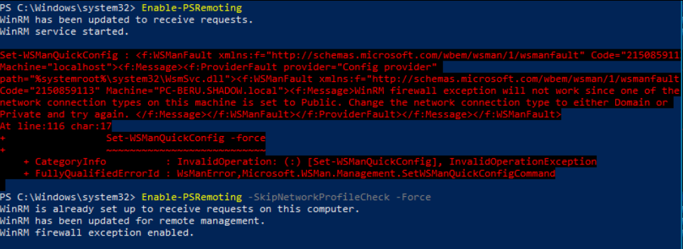 <summary>Enable-PSRemoting -SkipNetworkProfileCheck -Force</summary>