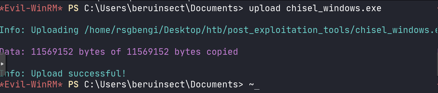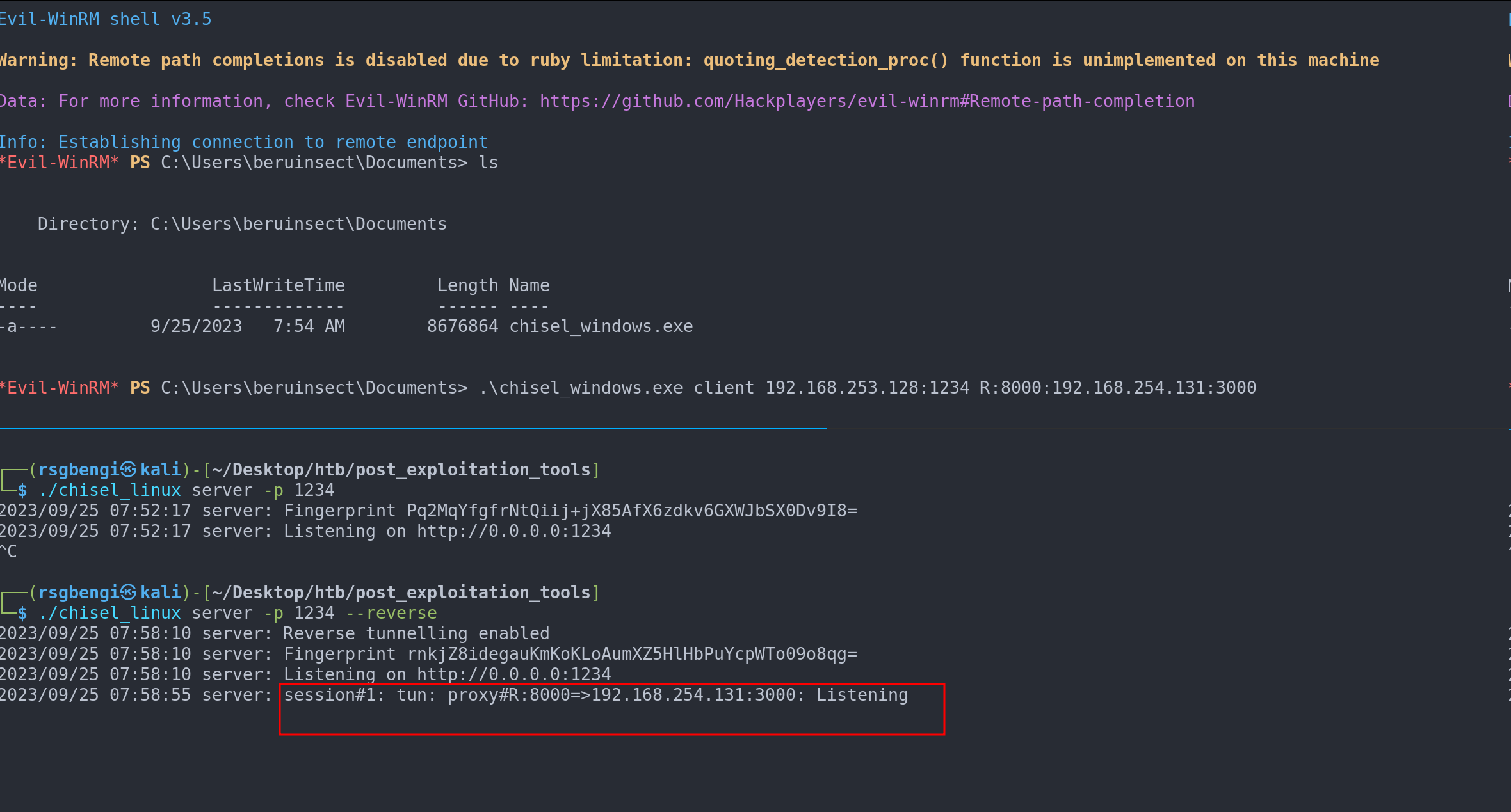 Chisel, a more versatile tool, also allows local port forwarding but requires initial setup. First, upload the Chisel binary to the compromised machine, possibly using WINRM. Then set up Chisel in a client-server model.