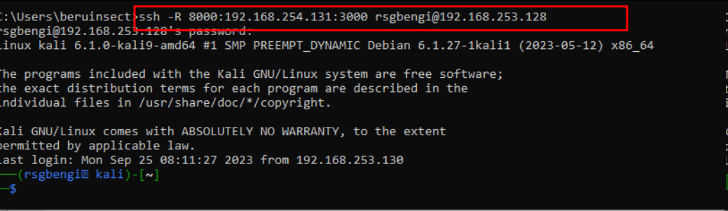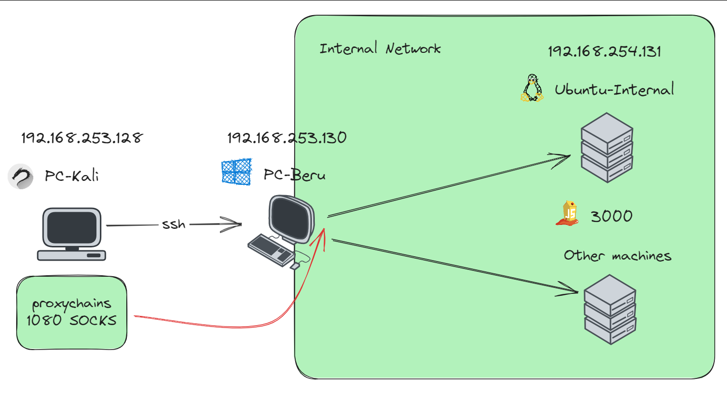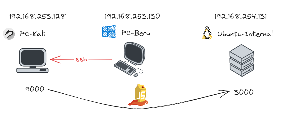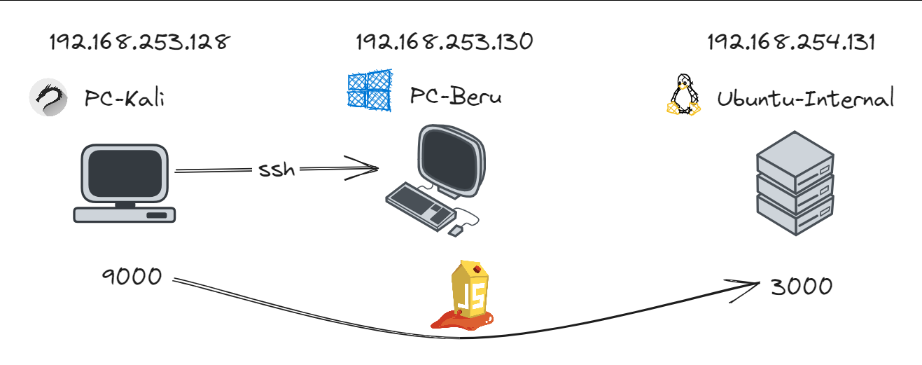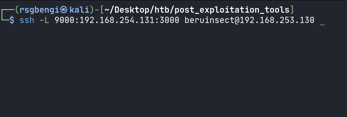 Suppose we’ve gained SSH access to a machine (192.168.253.130) and want to reach a service on another machine (192.168.254.131) at port 3000. We can set up a local port forwarding using SSH with the following command: