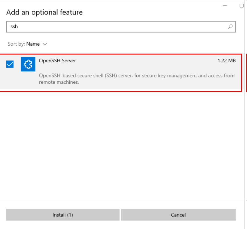 - Click “Add a feature”, find “OpenSSH server”, expand the option, and install it.
