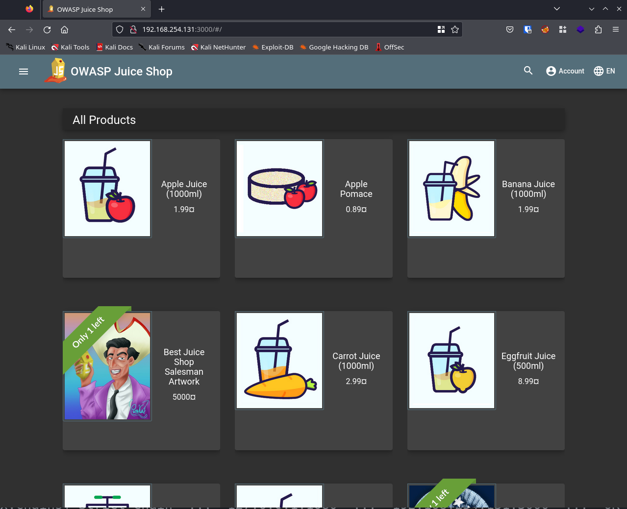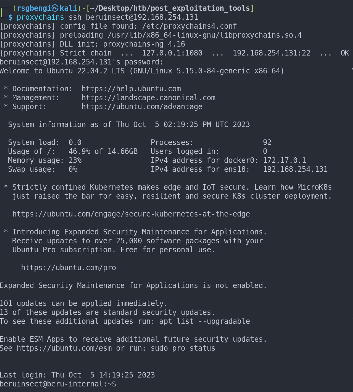 - Compromised Machine (192.168.253.130): We’ll utilize this machine, which we’ve managed to compromise, as a launchpad to access services on another target machine (192.168.254.131). Notably, the “Beru Internal” machine at 192.168.254.131 hosts several services, including a vulnerable web page on port 3000 (JuiceShop).