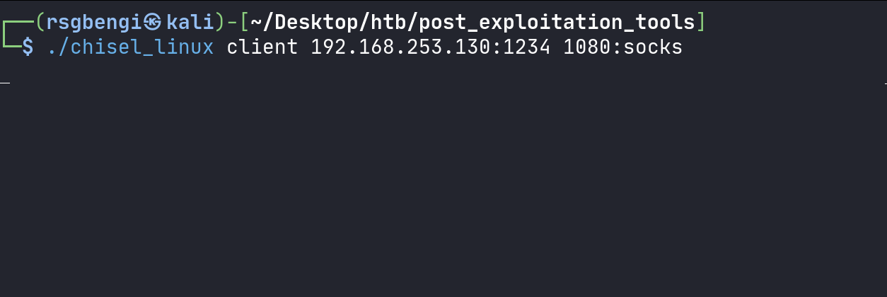 chisel_linux client [PivotMachineIP]:[ChiselServerPort] [LocalSOCKSPort]:socks