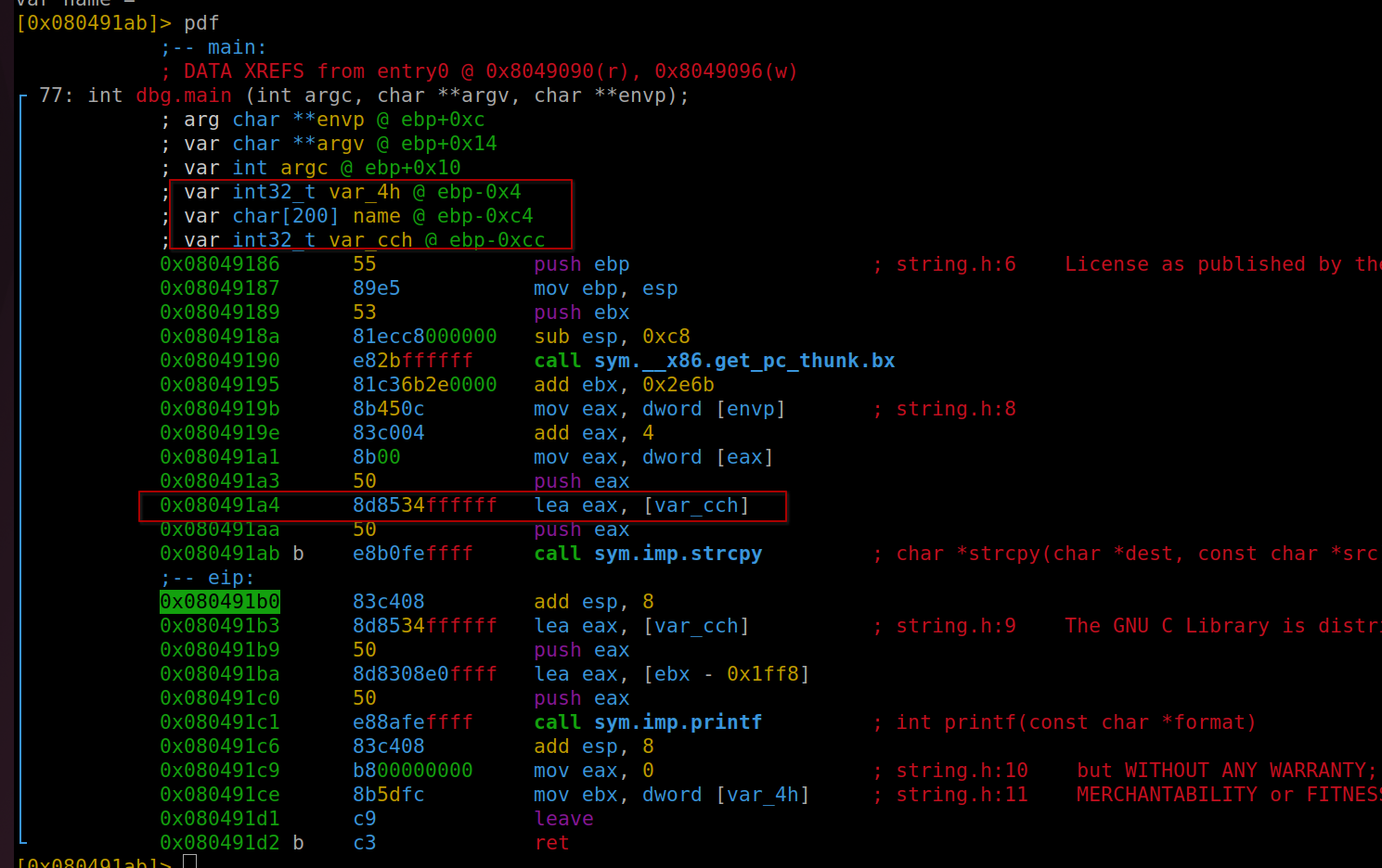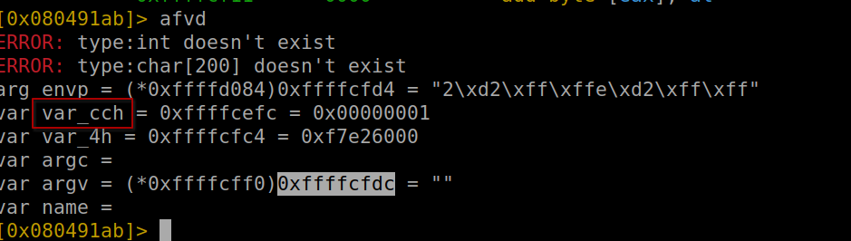 Running this exploit in radare, positioned just before the strcpy execution, allows us to observe the memory addresses of these variables. We’re particularly interested in var_cch for further analysis. To execute the exploit, use the command:
