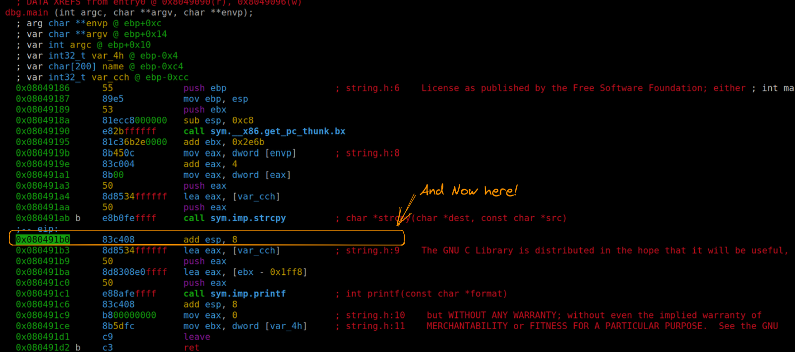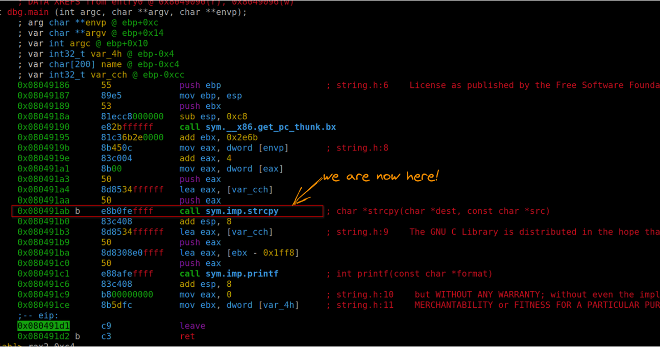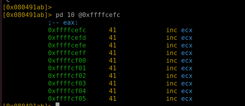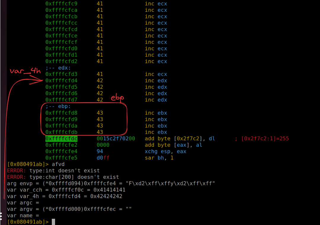 Further memory inspection (using the command pd 208) reveals that our payload also occupies var_4h (shown as “C” or 43 in hexadecimal) and ebp (“B” or 42 in hexadecimal). The subsequent four bytes are where we’ll direct the return address.