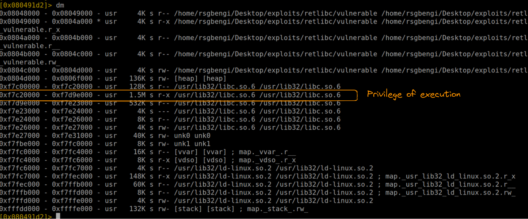 This command displays the dynamic modules loaded in the process, including various instances of libc (like /usr/lib32/libc.so.6). Among these, our focus is on the instance with execution permission. This specific libc address is the starting point from which we’ll calculate the positions of our gadgets.