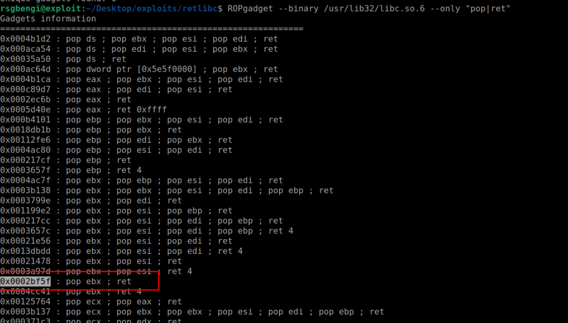 ROPgadget /usr/libc32/libc.so.6 --only "pop|ret"