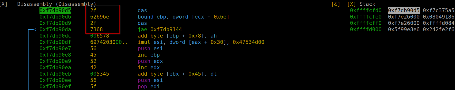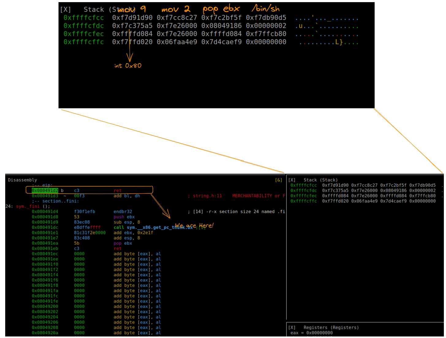 Upon analysis, we can observe how the payload effectively loads the string into ebx. The execution of ‘ret’ followed by ‘int 0x80’ ensures proper functioning.